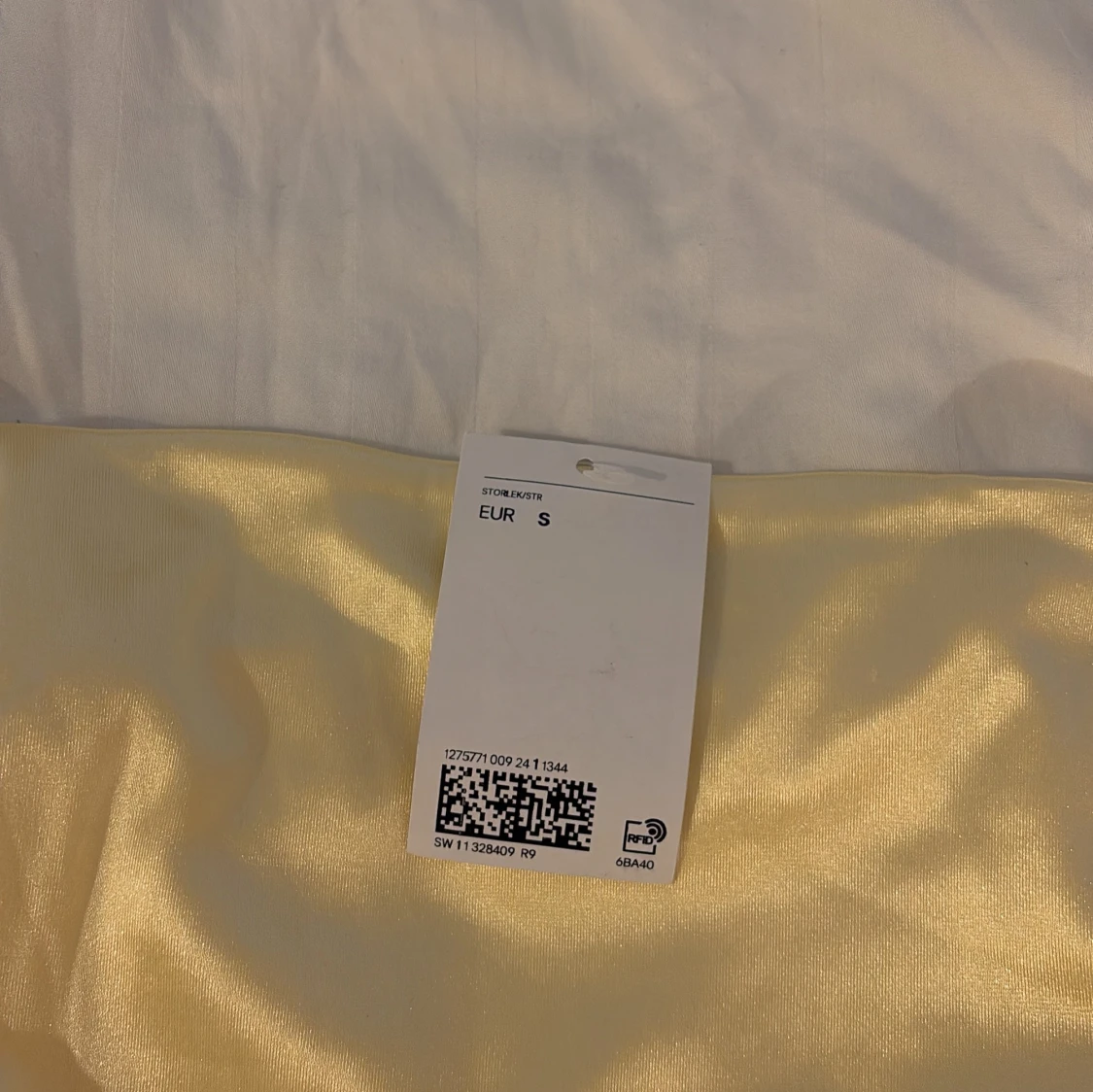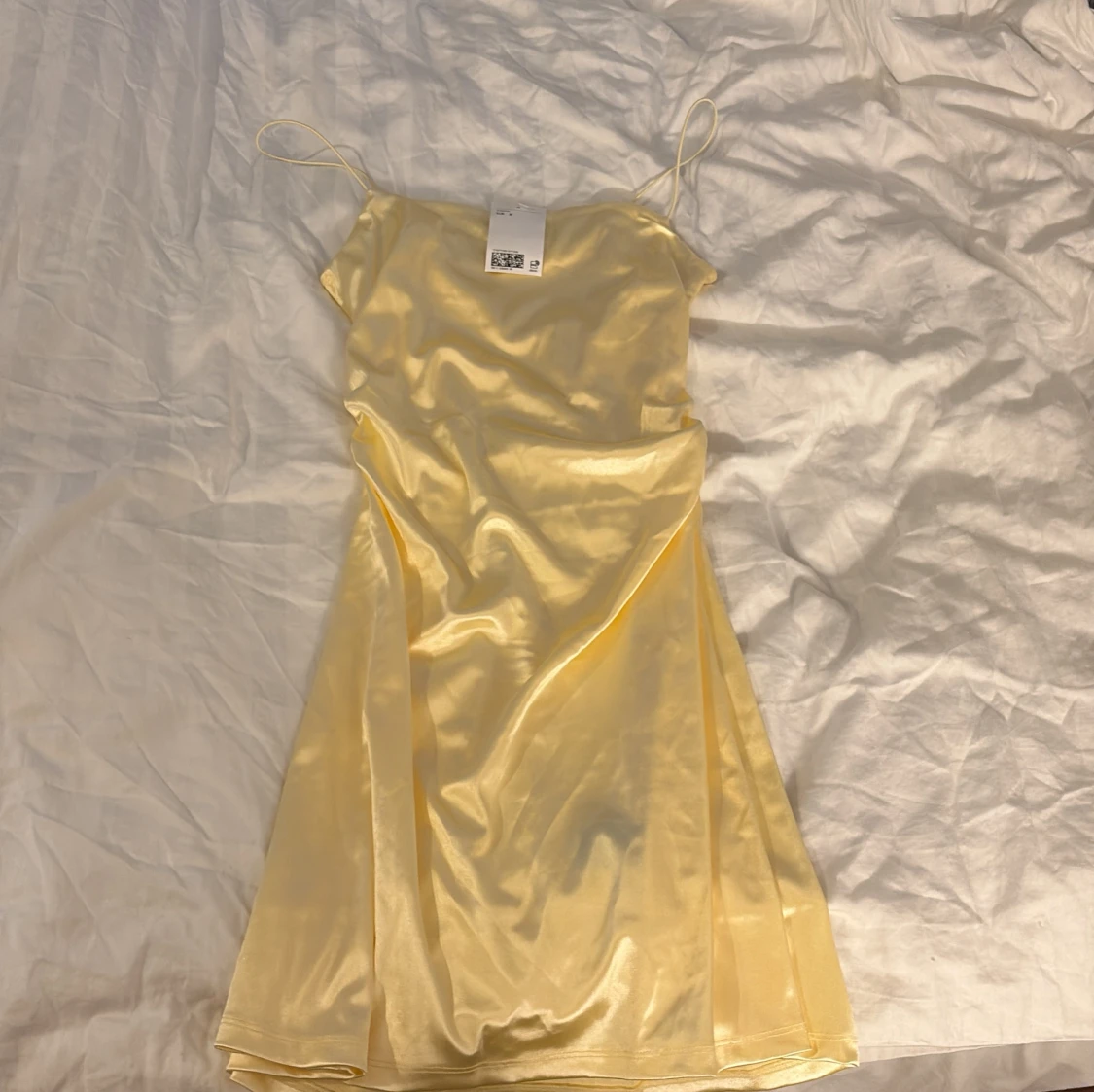 Supersöt ljusgul klänning i satin med smala axelband och lätt glansig finish. Modellen är kort och har en enkel, stilren design som ger en fräsch och somrig vibe. Helt oandvänd ❤️❤️