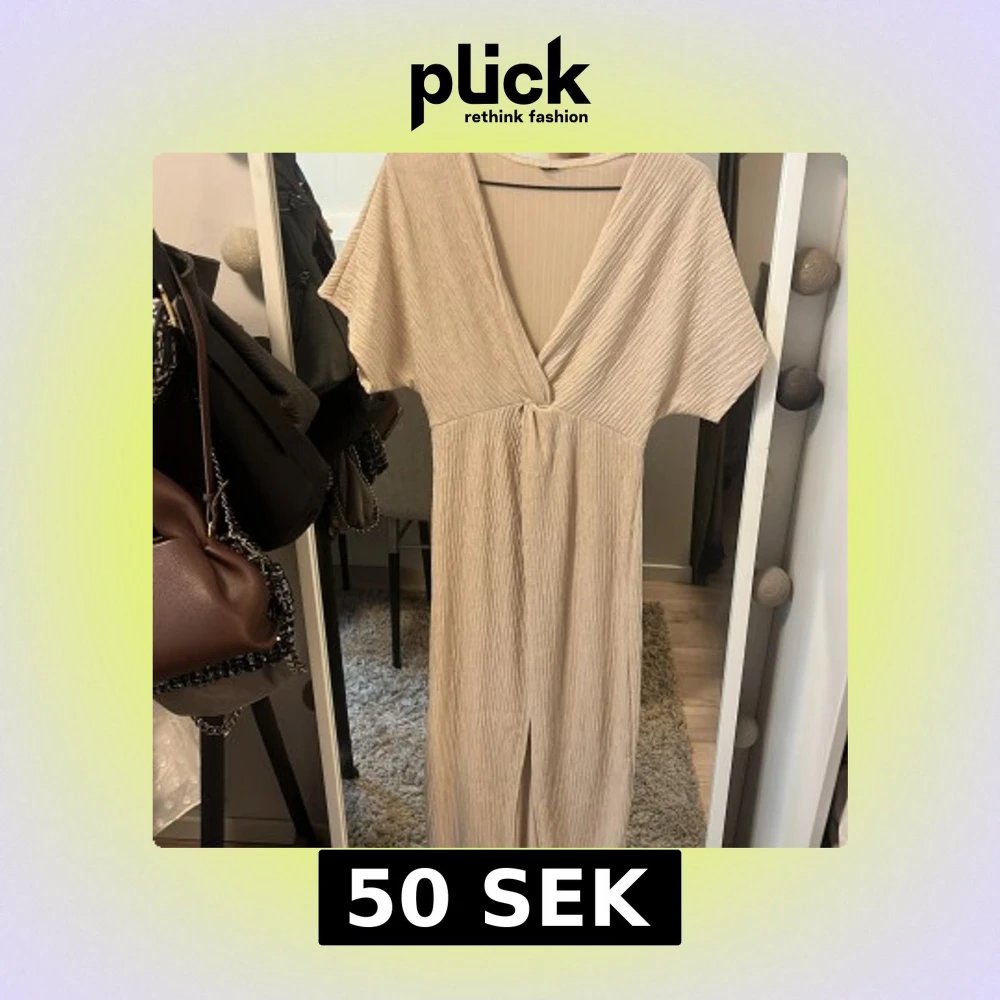 Säljer en beige ribbad klänning med omlott-design och v-ringning. Klänningen har korta ärmar och en knytning i midjan som ger en snygg siluett. Perfekt för dig som gillar en stilren och avslappnad look. Från nakd