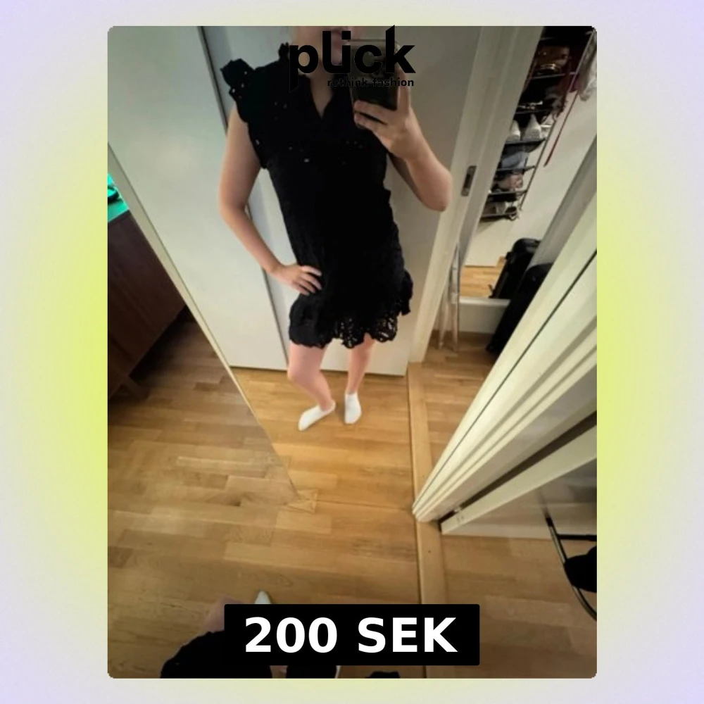 Säljer en svart kortklänning med fina spetsdetaljer och volangkant nertill. Klänningen är ärmlös med markerade axlar och har en feminin, figurnära passform. Perfekt för dig som gillar en elegant och stilren look.