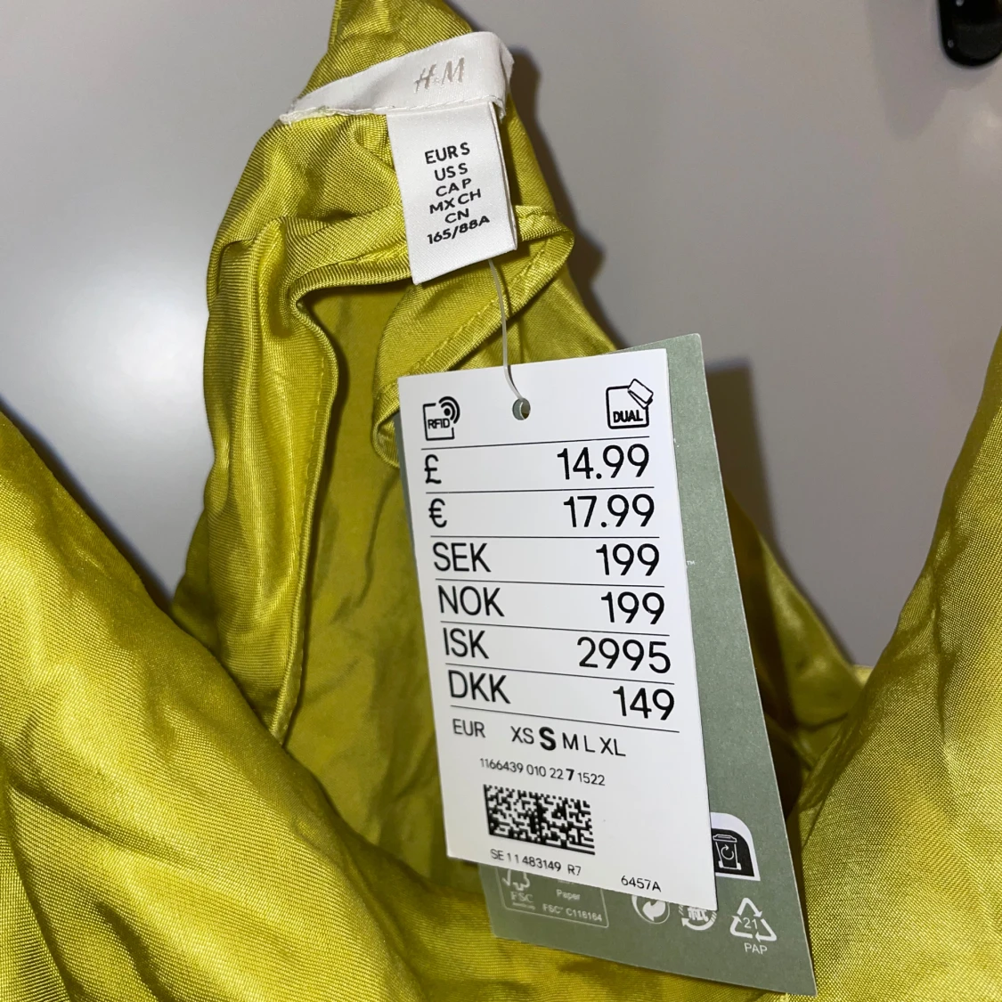Säljer en snygg gul klänning från H&M i glansigt satinmaterial. Klänningen har en kort längd och smala axelband, perfekt för dig som vill sticka ut med en färgstark look. Passformen är normal och tyget har en lyxig känsla.