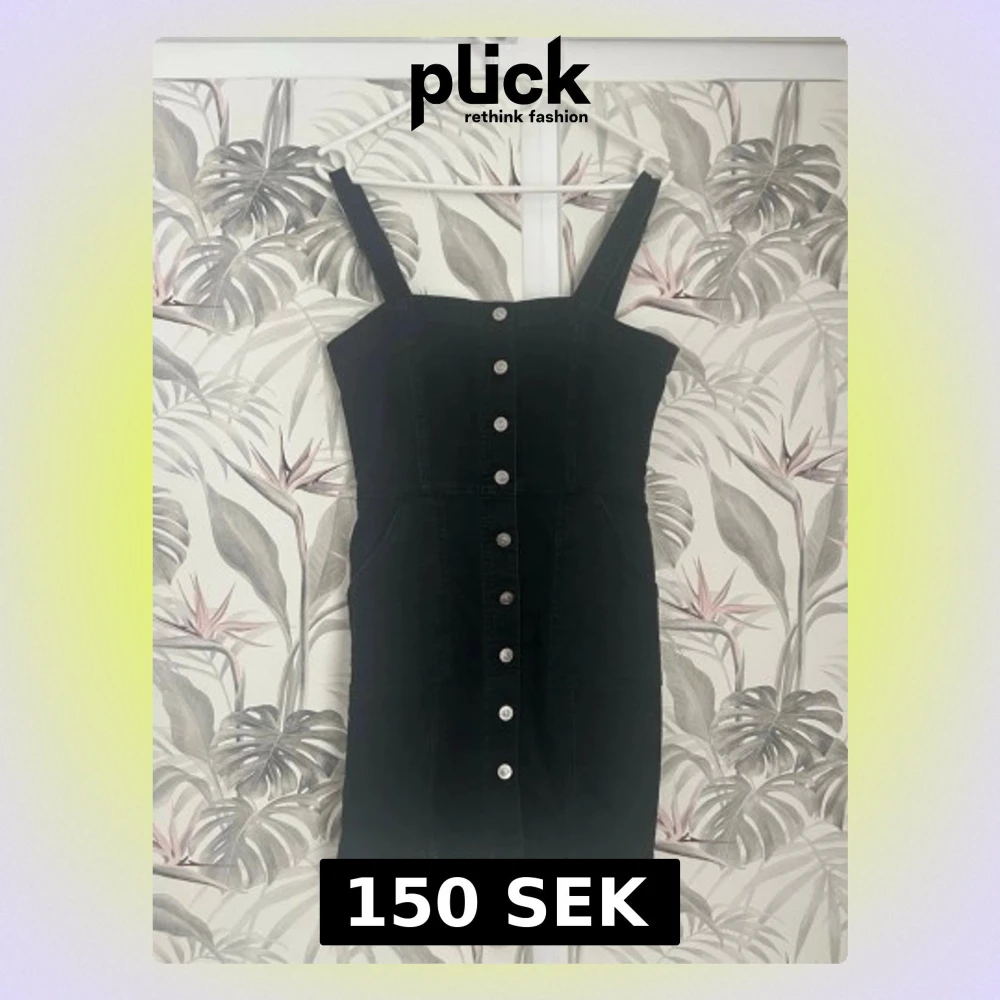 Säljer en svart kort jeansklänning med breda axelband och silverfärgade knappar framtill. Klänningen har fickor på sidorna och justerbara axelband för perfekt passform. Enkel och stilren modell som är lätt att styla.