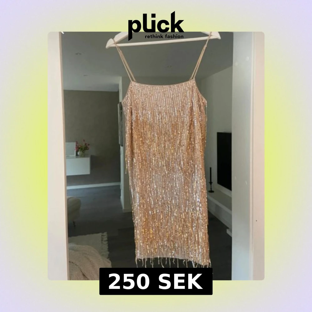 Champagnefärgad kortklänning från H&M med tunna axelband och glittriga paljetter över hela klänningen. Klänningen har en rak passform och är perfekt för dig som vill sticka ut med en glittrig look. Materialet är polyester och ger en lyxig känsla.