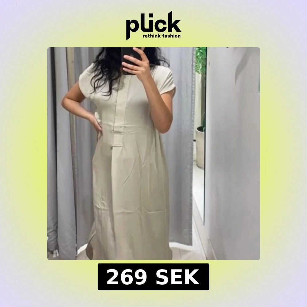 Säljer en stilren beige långklänning med korta ärmar och rak passform. Klänningen har minimalistisk design med diskreta sömdetaljer framtill. Perfekt för dig som gillar enkel och clean stil.