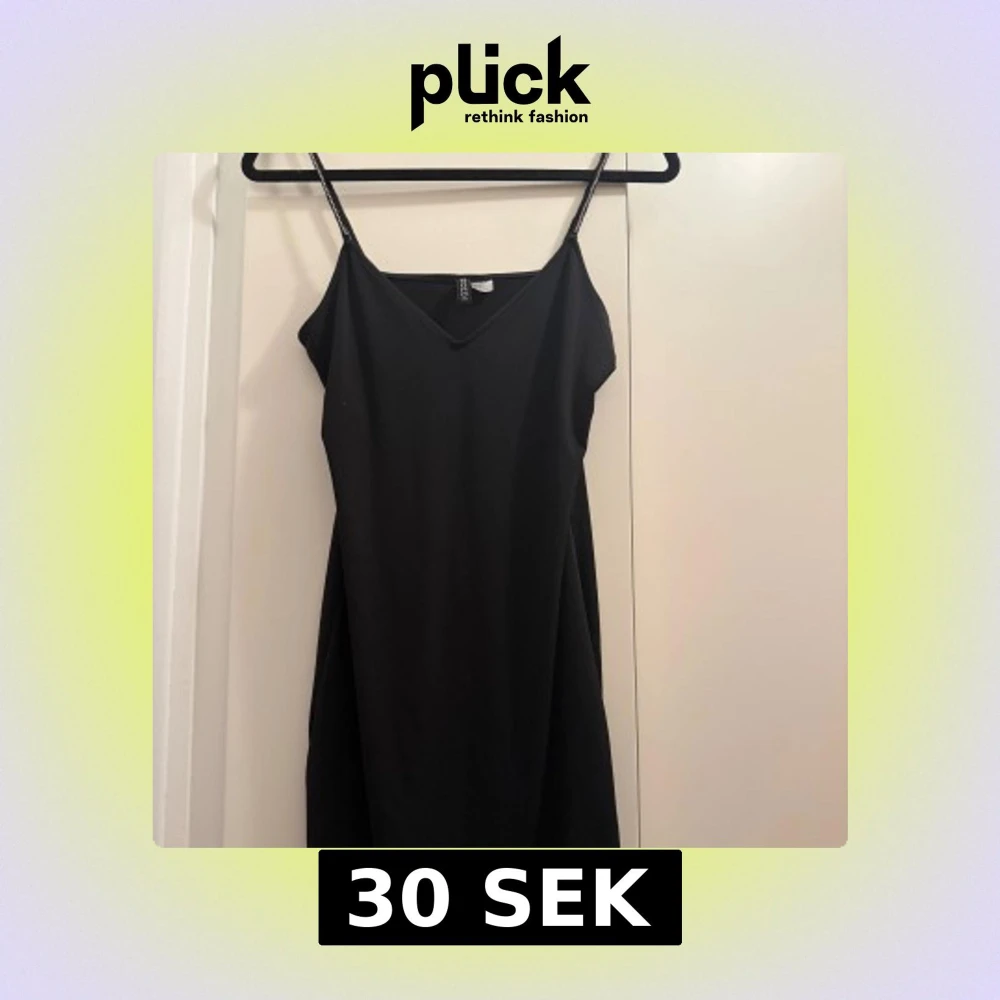 En svart kortklänning från H&M med smala axelband dekorerade med glittriga stenar. Klänningen har v-ringning och en enkel, stilren design som ger en snygg och trendig look. Perfekt för dig som gillar minimalistiskt men ändå vill ha en touch av glitter.