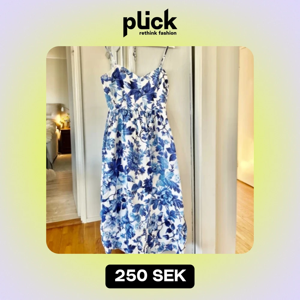 Vit och blå blommig linneklänning från H&M. Den är helt oanvänd med prislappen kvar. Storlek S
