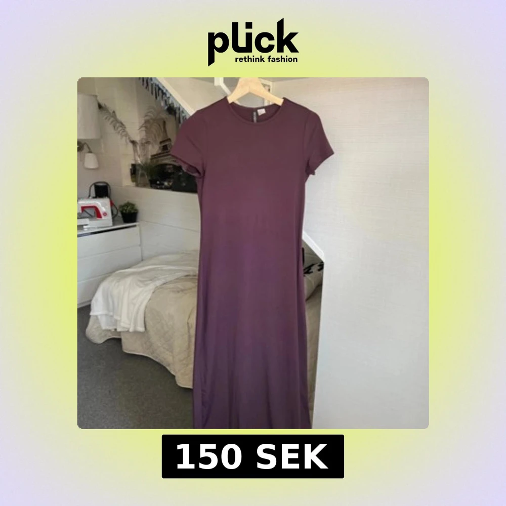 Enkel och stilren långklänning i lila från H&M. Klänningen har rund halsringning och korta ärmar, tillverkad i mjukt och stretchigt material som ger en bekväm passform. Perfekt för dig som gillar minimalistisk stil.