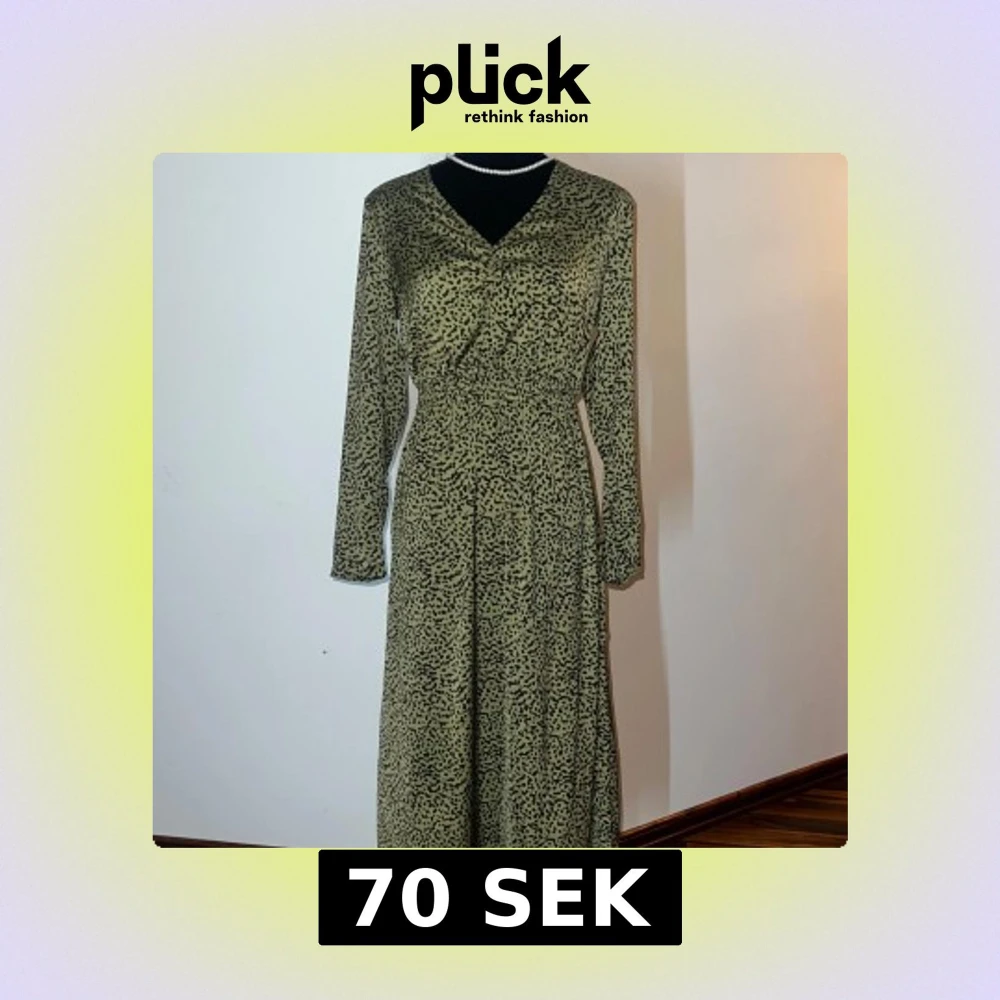 Snygg grön klänning med leopardmönster och v-ringning. Klänningen har långa ärmar och en elastisk midja för en bekväm passform. Perfekt för att sticka ut med stil!