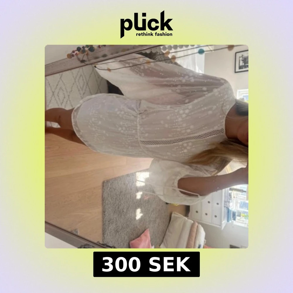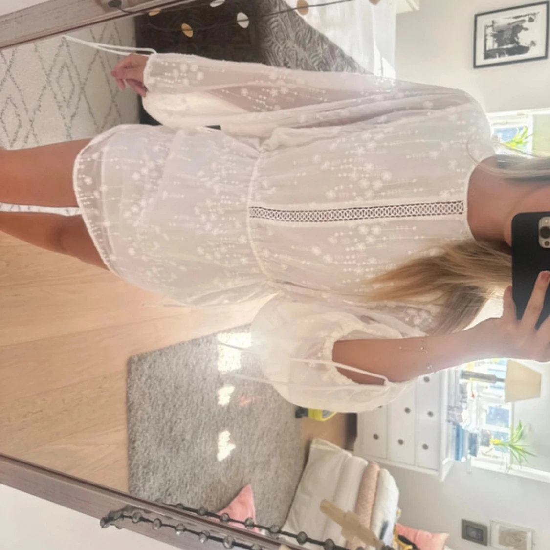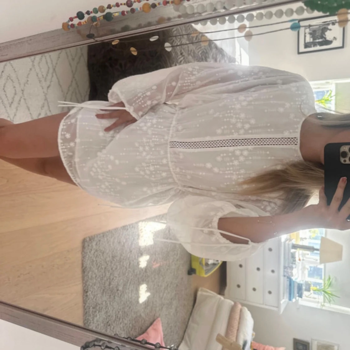Supersöt vit kortklänning med transparenta, voluminösa långärmar och diskret prickigt mönster. Klänningen har en snygg spetsdetalj framtill och knytband vid ärmsluten.