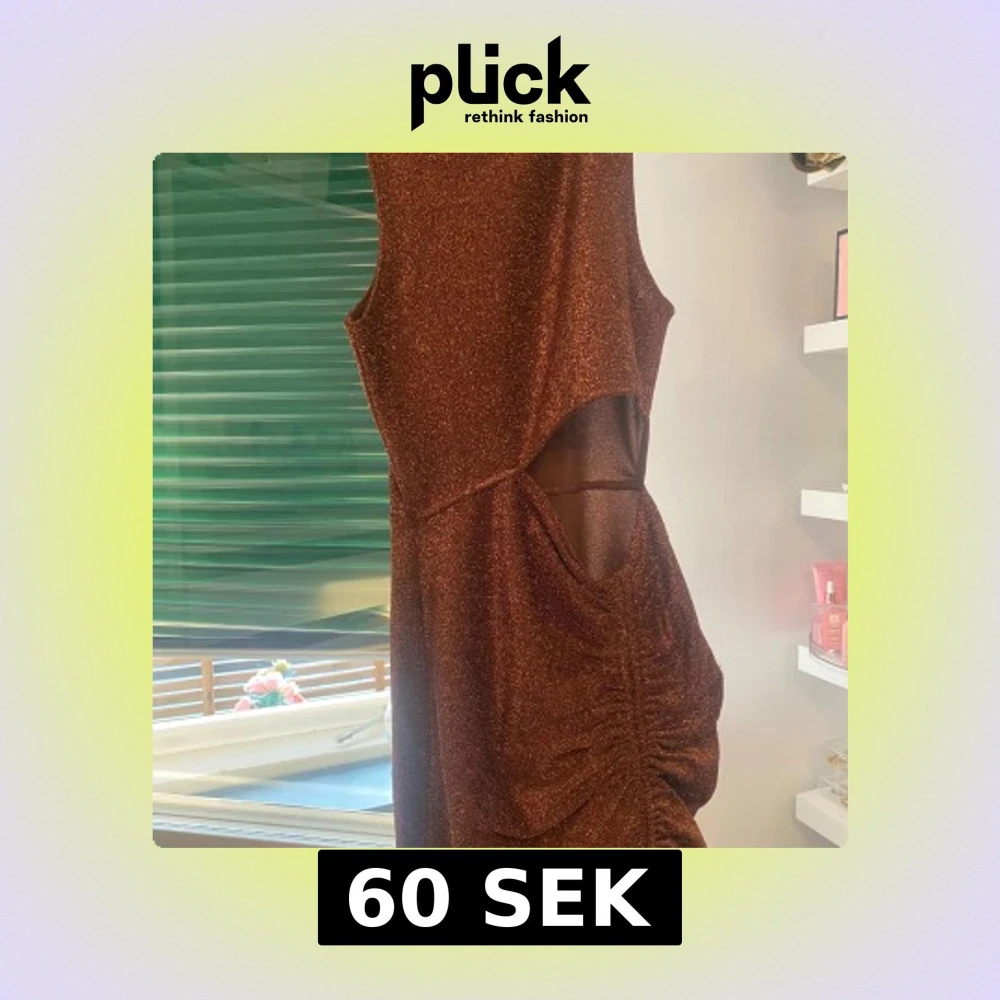 Säljer en brun glittrig klänning med ärmlös design och snygg cut out-detalj i midjan. Klänningen har åtsittande passform och lätt rynkade partier på sidan. Perfekt för dig som vill sticka ut!
