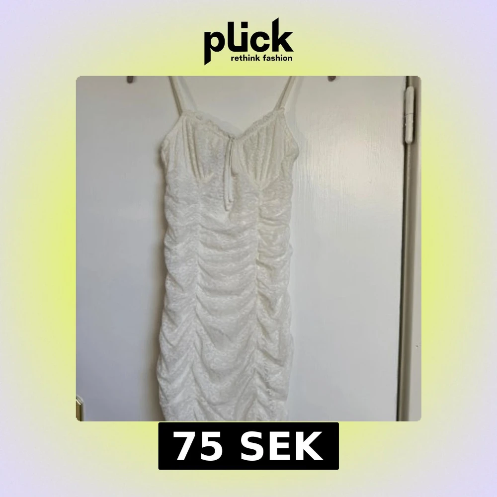 Supersöt vit kortklänning från H&M med smala axelband och omlott-detalj vid bysten. Klänningen har snygg rynkning längs hela framsidan och är gjord i ett spetsliknande material som ger en romantisk vibe. Perfekt för sommarens alla tillfällen!