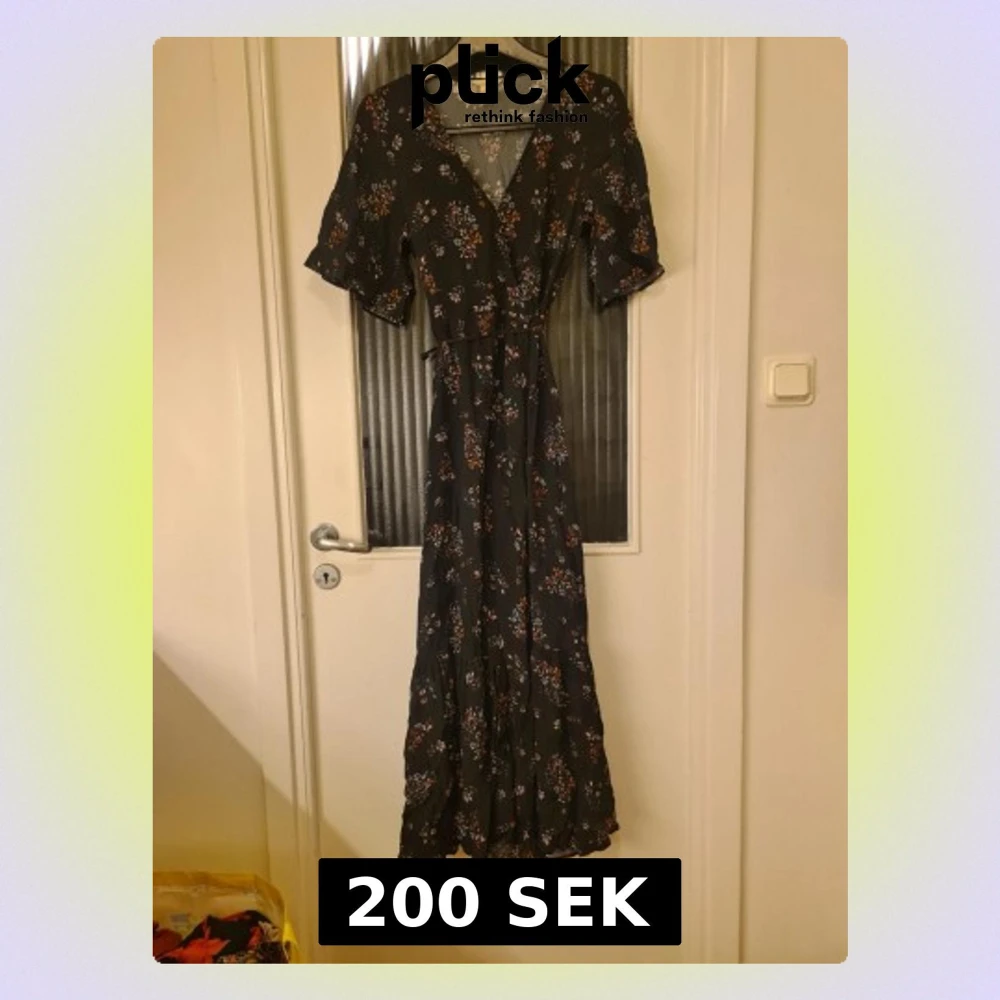 Svart långklänning från H&M med v-ringning och korta puffärmar. Klänningen har ett fint blommigt mönster i lila, orange och vitt samt ett smalt knytband i midjan. Materialet är lätt och luftigt, perfekt för varmare dagar.