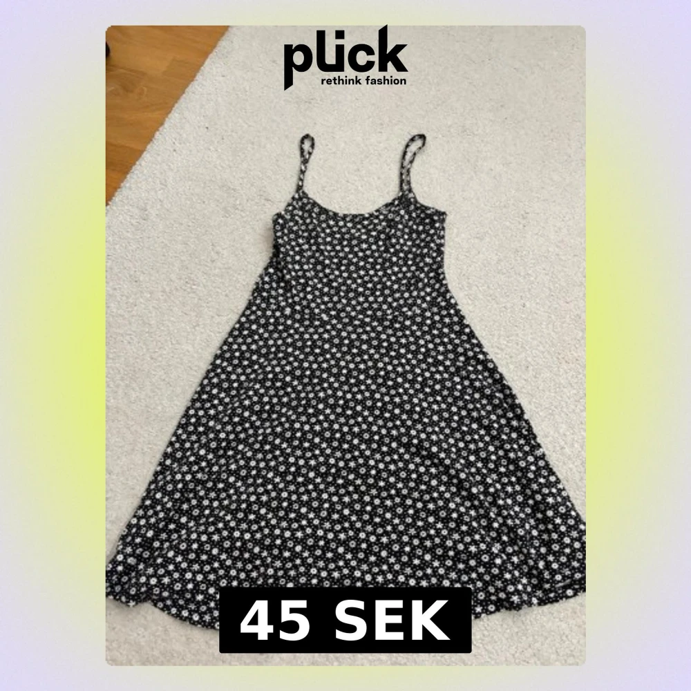Söt svart klänning med vita blommor och tunna axelband. Klänningen har en lätt utställd passform och är perfekt för varma dagar. Materialet känns mjukt och luftigt, vilket gör den skön att bära hela dagen.