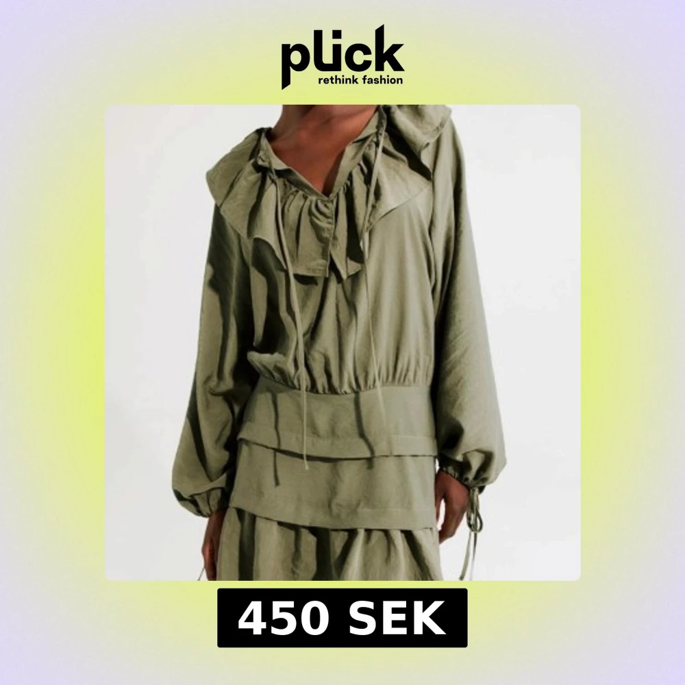 Snygg olivgrön klänning med volangdetaljer och knytning framtill. Klänningen har långa ärmar med resår vid ärmsluten och en lös passform som ger en avslappnad look. Den är från hm och är ny med prislapp😇
