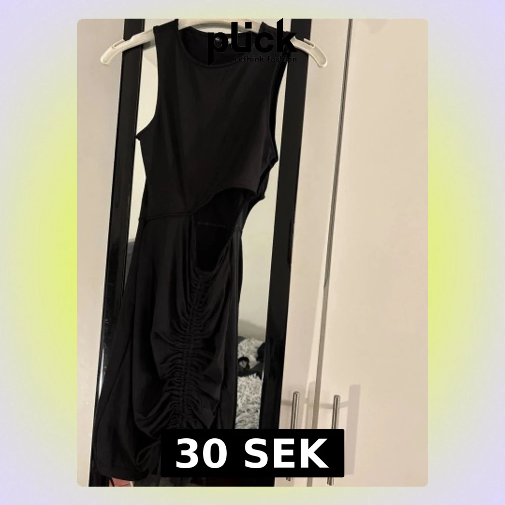 Säljer en svart, ärmlös kortklänning med cool cut-out detalj i midjan och snygg rynkning med snörning framtill som är justerbar . Klänningen har en tight passform och är gjord i ett mjukt, stretchigt material som sitter skönt på kroppen.