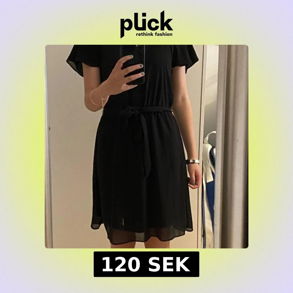Svart klänning från H&M i storlek XS. Modellen har kort ärm, knytband i midjan och är tillverkad i mjuk polyester. Klänningen är luftig och har en lätt transparent känsla nertill. Perfekt för dig som gillar en enkel men stilren look. Använd en gång.