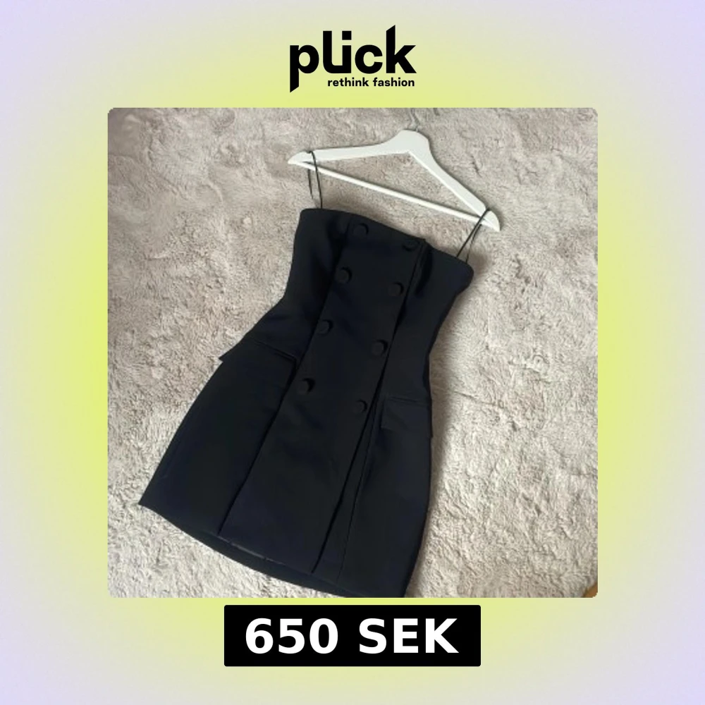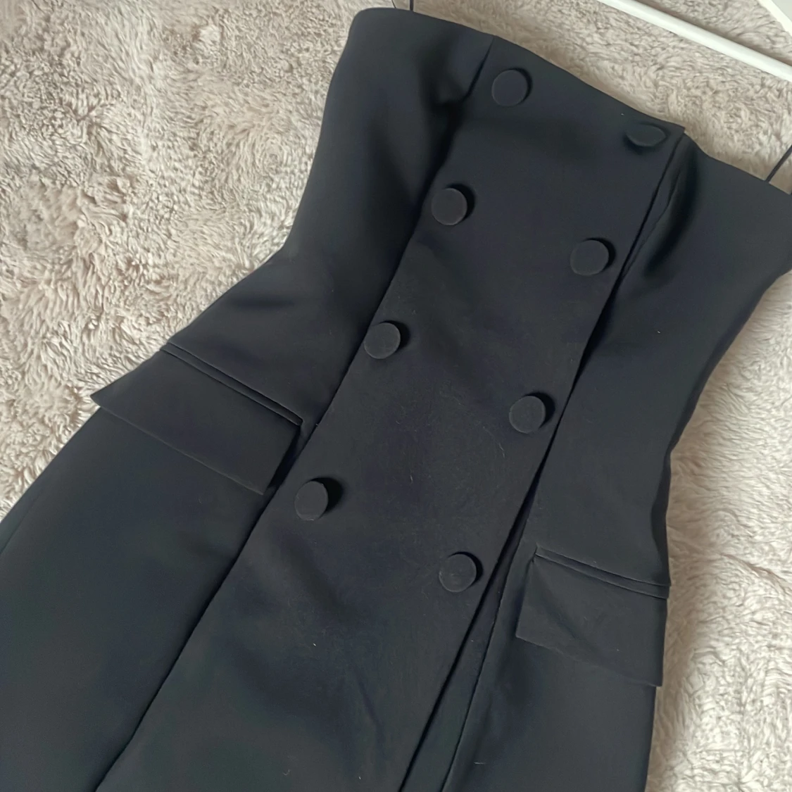 Snygg svart axelbandslös kort klänning med dubbelknäppning framtill och en väldigt elegant passform .
