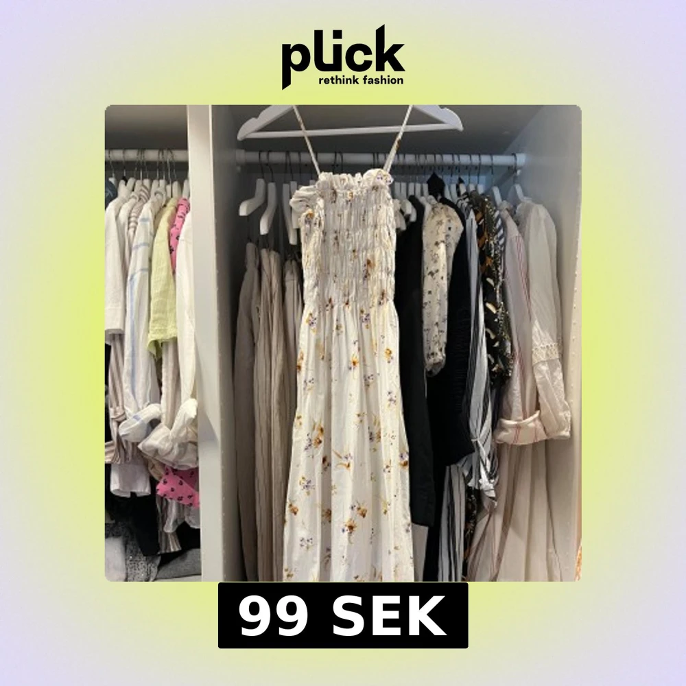 Supersöt långklänning från H&M i vitt med små lila och gula blommor. Klänningen har smala axelband, smock upptill och ett flowigt fall. Perfekt för varma dagar och ger en romantisk vibe. Materialet är mjukt och känns lätt mot huden. Klänningen slutar ungefär vid anklarna.