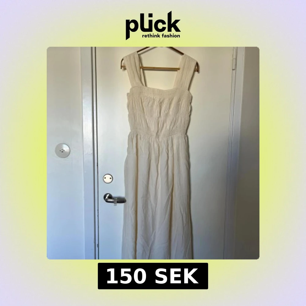 Superfin klänning från H&M i ljus beige färg. Klänningen har breda axelband, smockad överdel, luftigt tyg och underkjol, därav ej genomskinlig. Oanvänd, prislappen kvar. Passar xs/s pga stretchen i smockade överdelen.