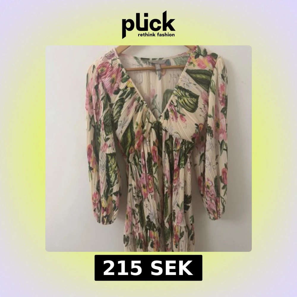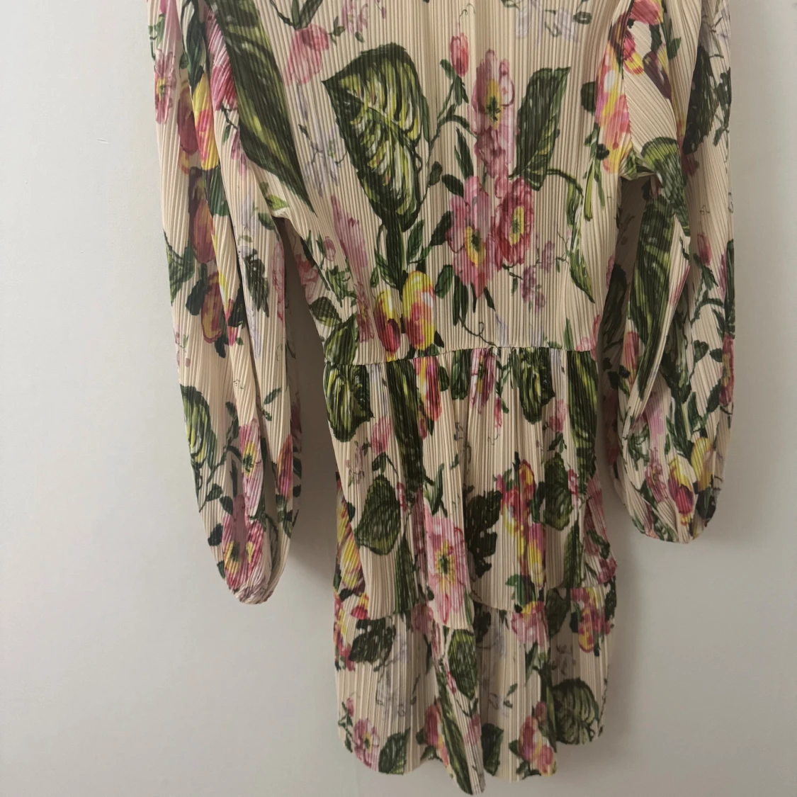 Superfin kortklänning från H&M med plisserat tyg, v-ringning och trekvartsärmar. Klänningen har ett romantiskt blommönster i rosa, grönt och gult på en ljusbeige bas. Perfekt för sommarens alla tillfällen! Endast använd en gång, så gott som ny