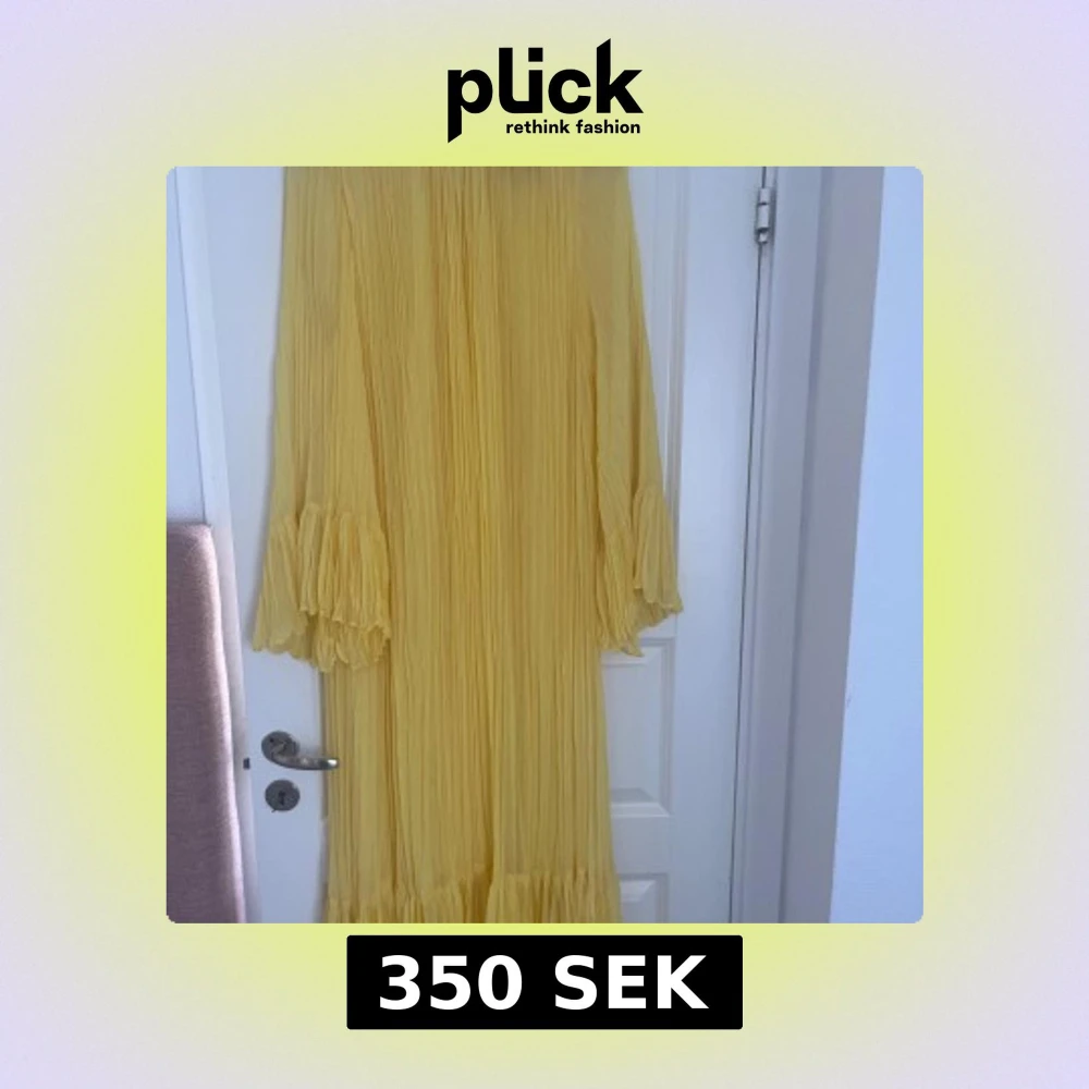 Lång gul klänning i plisserat tyg med vida, volangprydda ärmar och rund halsringning. Klänningen har en luftig och flowy känsla, perfekt för varma dagar. Stängs i nacken och har fina detaljer vid ärmslut och nederkant.