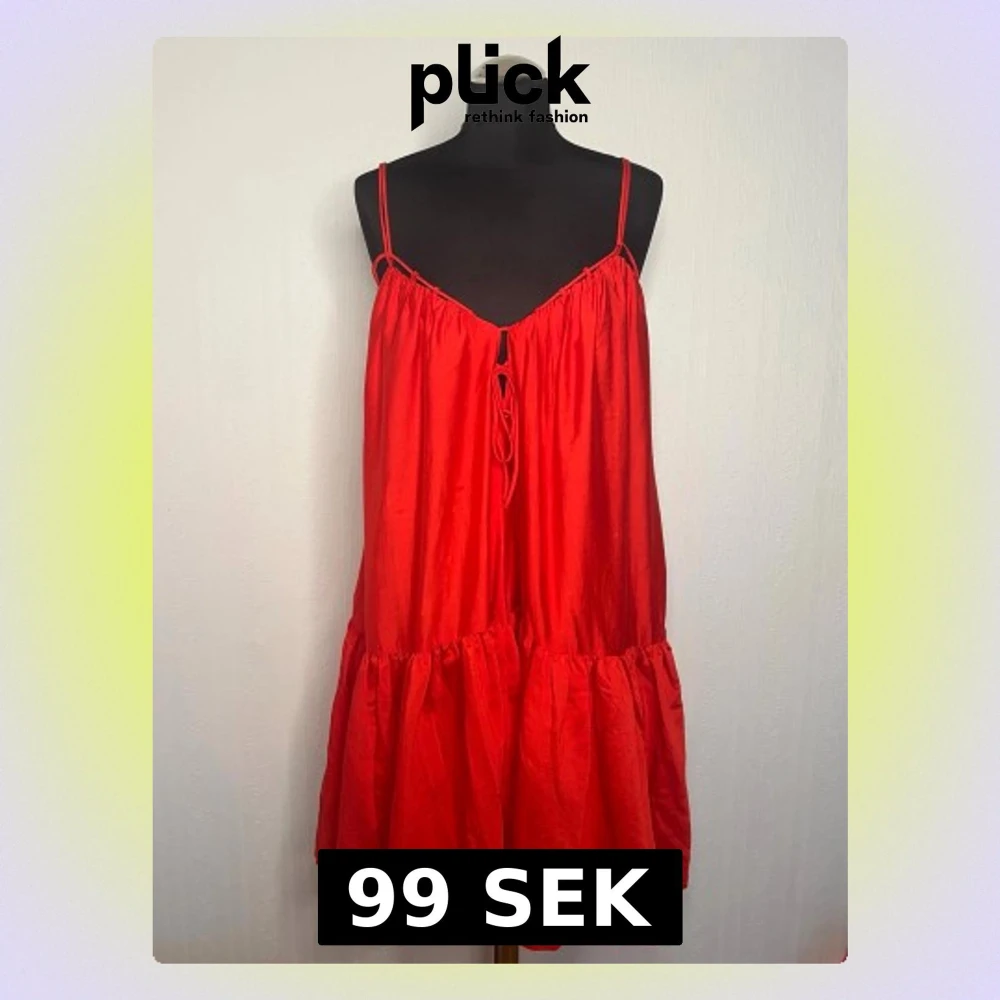 Snygg röd kort klänning från H&M i storlek XS. Klänningen har tunna axelband, v-ringning med snörning framtill och volang nedtill. Perfekt för varma dagar och enkel att styla med sneakers eller sandaler.oanvänd