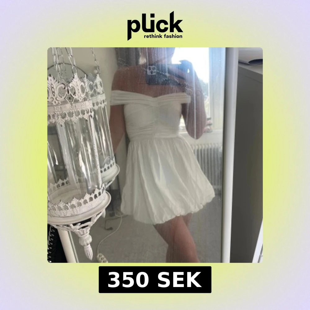 Supersöt vit kort klänning med offshoulder och puffig kjol. Storlek 32, perfekt som tex student klänning!