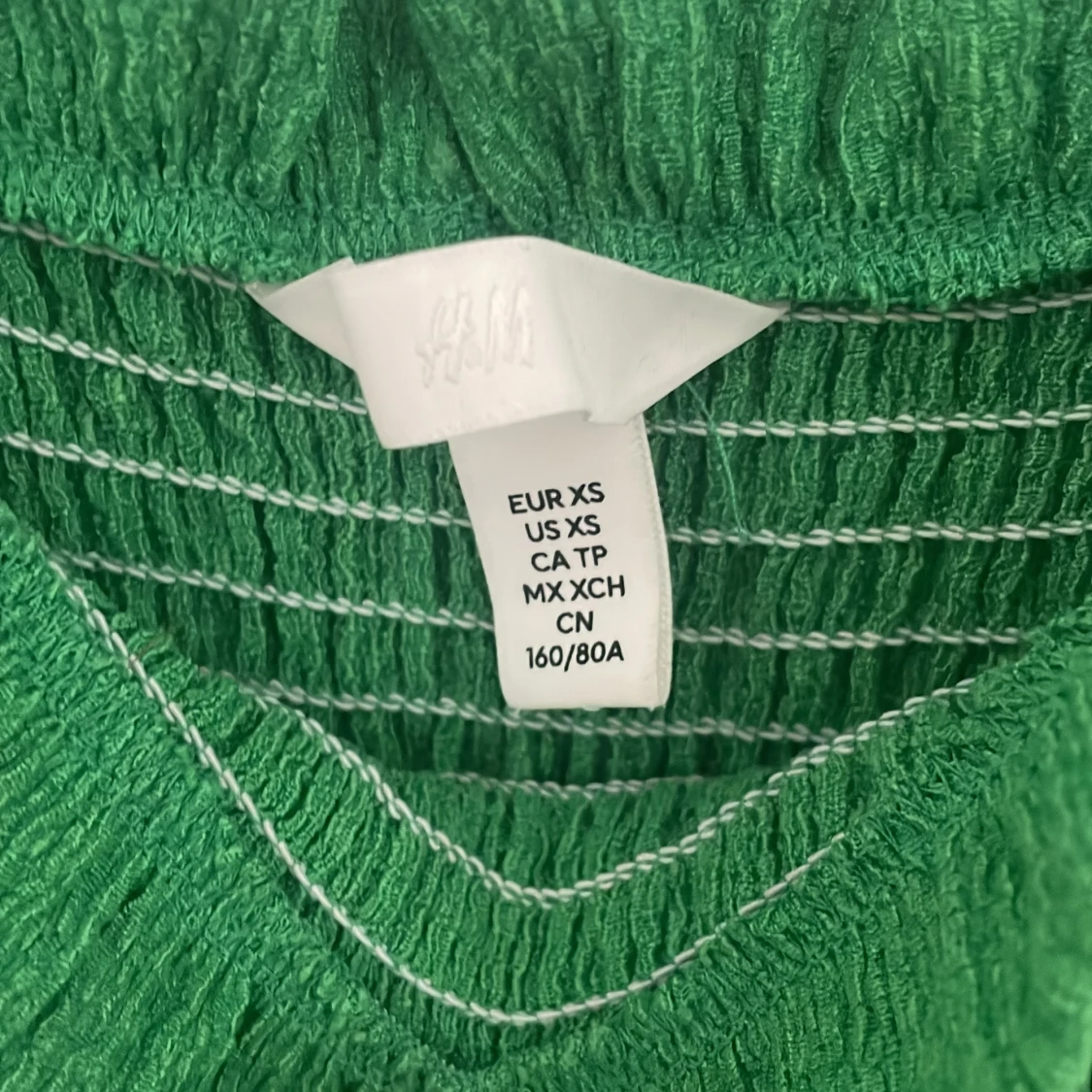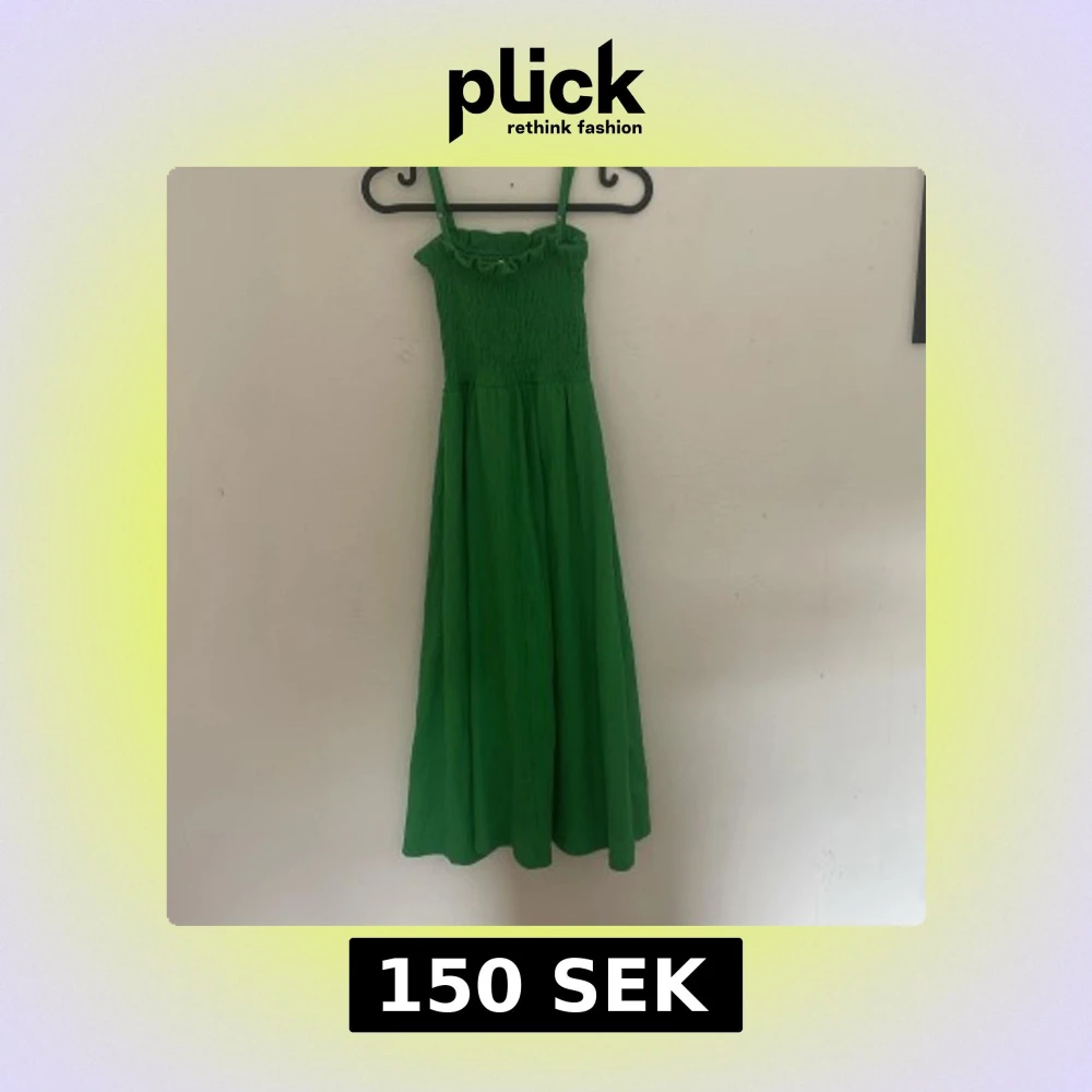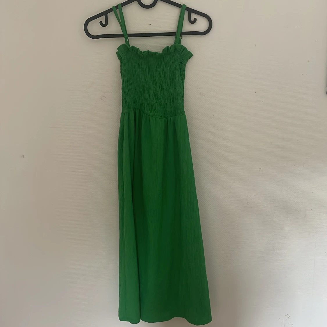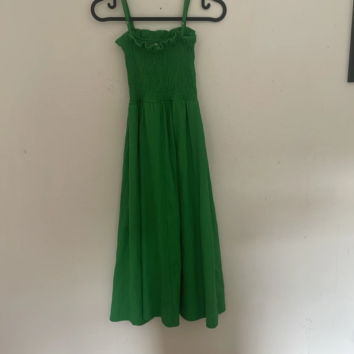 Snygg grön långklänning från H&M i storlek XS. Klänningen har smockad överdel, smala axelband och en flowy kjol. Perfekt för varma dagar och somriga vibes. Materialet känns lätt och luftigt.