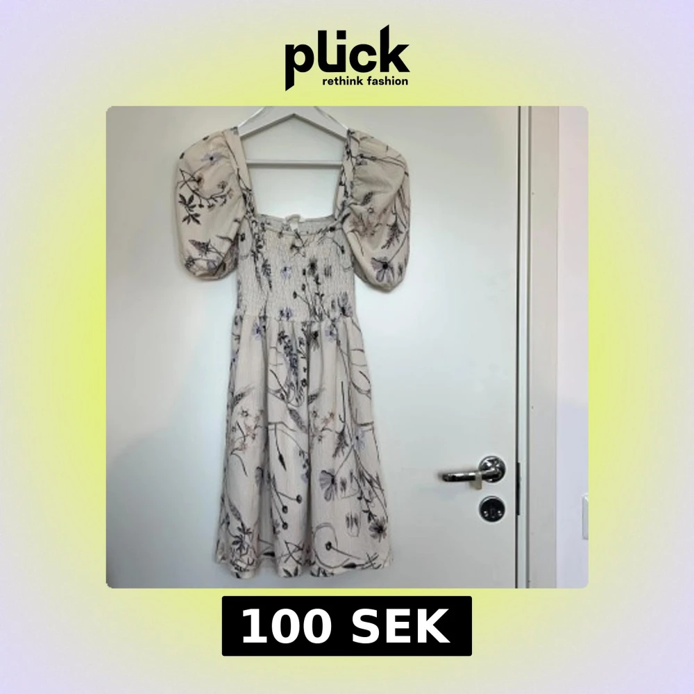 Supersöt kortklänning från H&M i ljusbeige med blommigt mönster. Klänningen har puffiga korta ärmar, smockad överdel och boatneck ringning. Använd endast ett fåtal gånger.