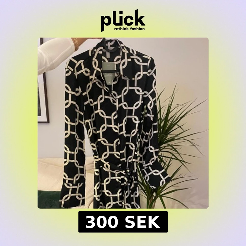 Snygg långklänning från H&M i svart med vitt grafiskt kedjemönster. Klänningen har långa ärmar, krage och knytband i midjan för en markerad siluett. Tillverkad i återvunnen polyester som ger ett mjukt och följsamt fall.