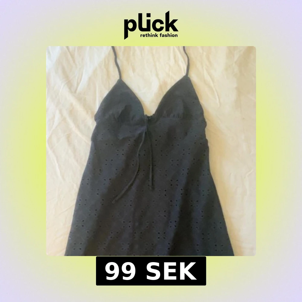 Snygg svart klänning med smala axelband och spetsdetaljer. Perfekt för en somrig look. Klänningen har en v-ringad design och knytning framtill med öppen rygg! Storlek xs!🥰