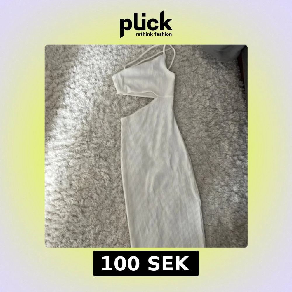 Säljer en vit ribbad långklänning med smala axelband och oneshoulder-design. Klänningen har en snygg cut-out vid midjan och är figurnära. Perfekt för dig som vill sticka ut med en modern och trendig look.
