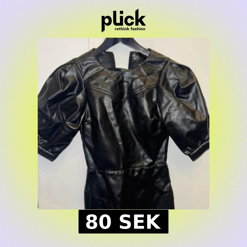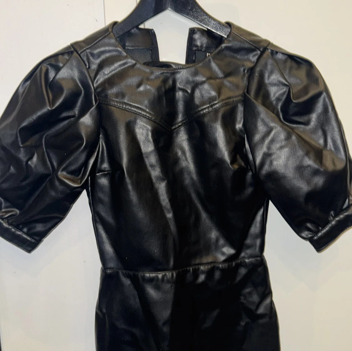 Cool svart klänning i skinnimitation med puffiga korta ärmar och rund halsringning. Snygg sömdetalj över bröstet och markerad midja. Perfekt för dig som vill sticka ut med en edgy look.
