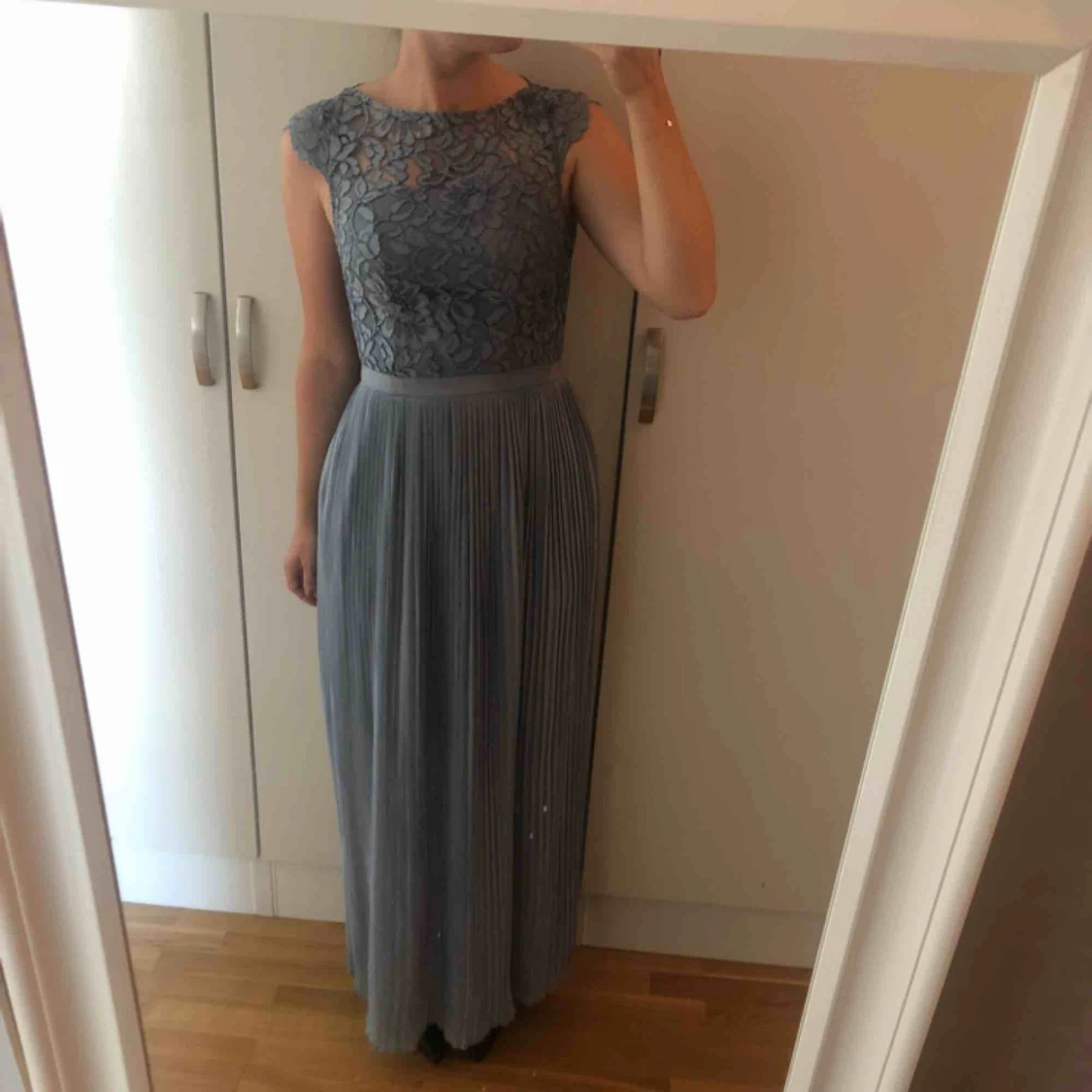 Superfin Ljusblå klänning från en speciallinje från HM från ett par år sedan, endast använd 1 gång på ett bröllop. Tyvärr är lappen borttagen men är i storlek S ungefär och jag är 165cm lång. Inga skador. Perfekt till sommarens bröllop!