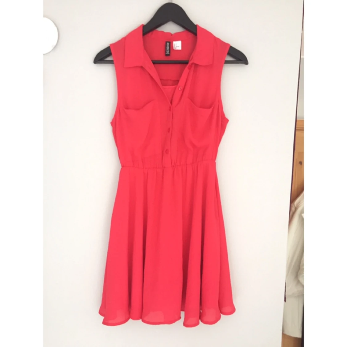 Hallon röd/rosa klänning från H&M Divided i storlek 34. I fint skick, med två bröstfickor.