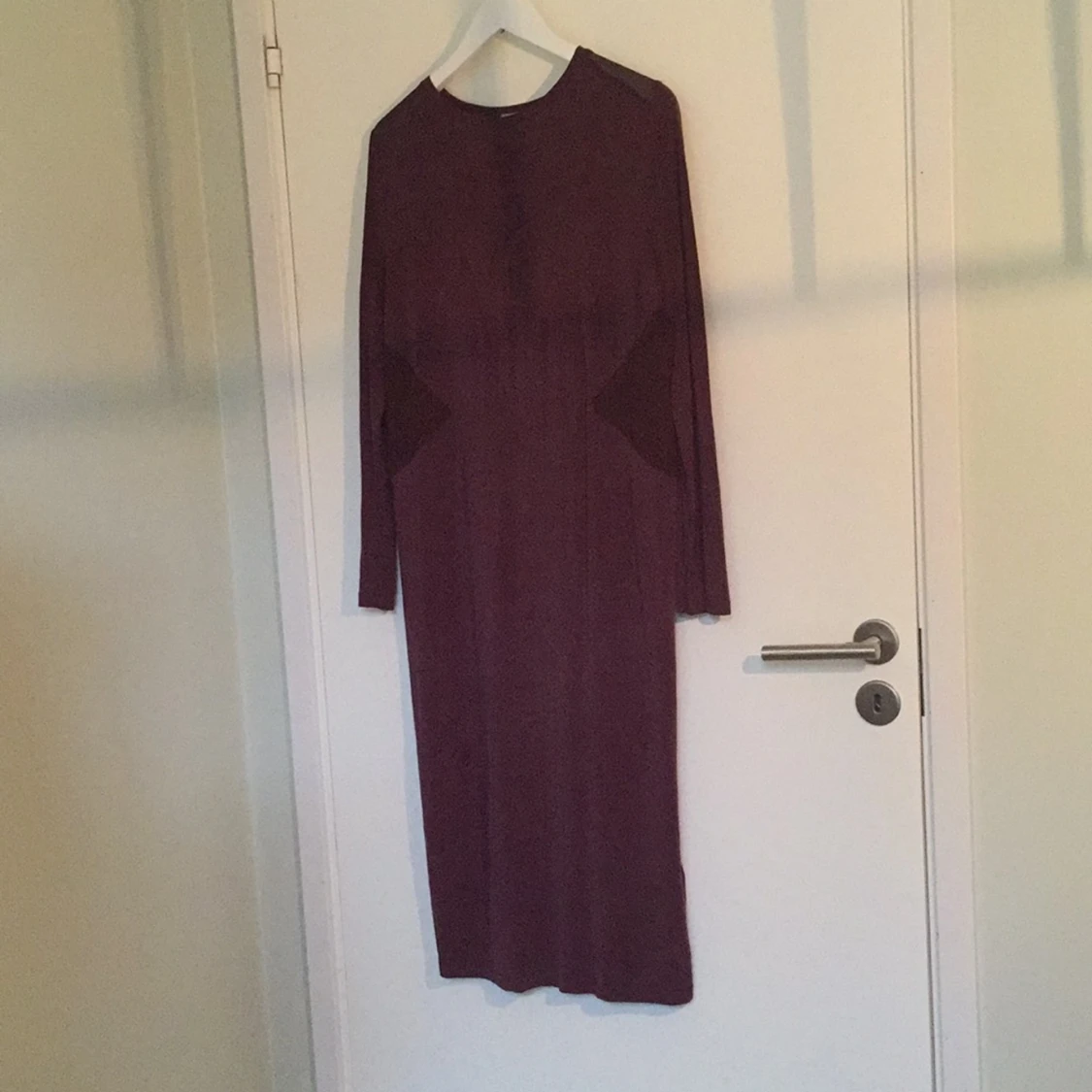 Vinröd längre klänning från HM-trend med transparenta inslag vid midjan. Se bilder. Frakt 30kr.