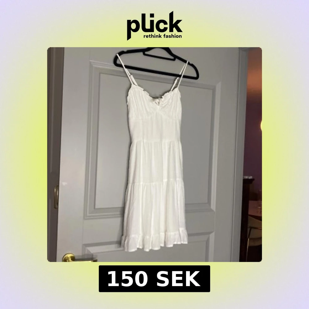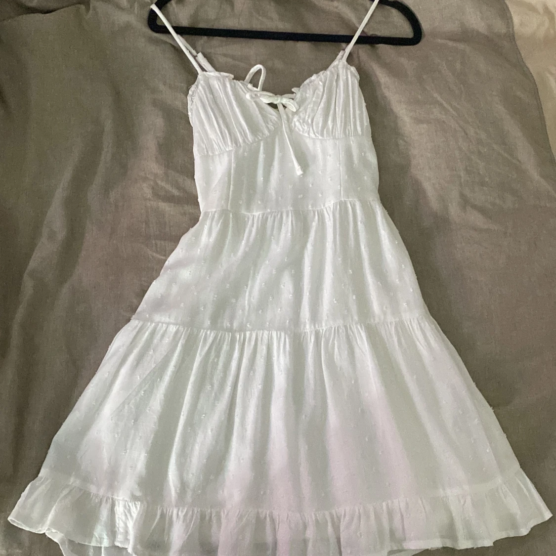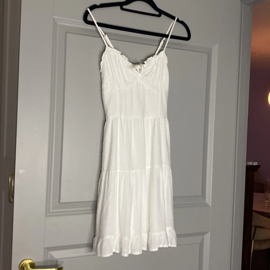Söt vit klänning med smala axelband och volangkant nertill. Klänningen har en lätt rynkad byst, knytning framtill och är sydd i ett luftigt material. Perfekt för varma dagar och har en feminin, romantisk stil.