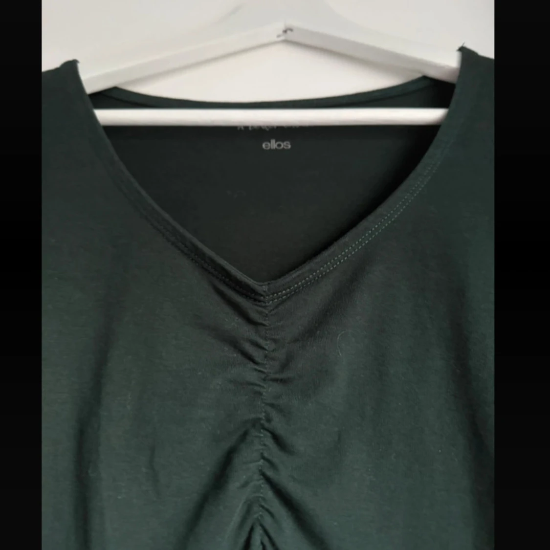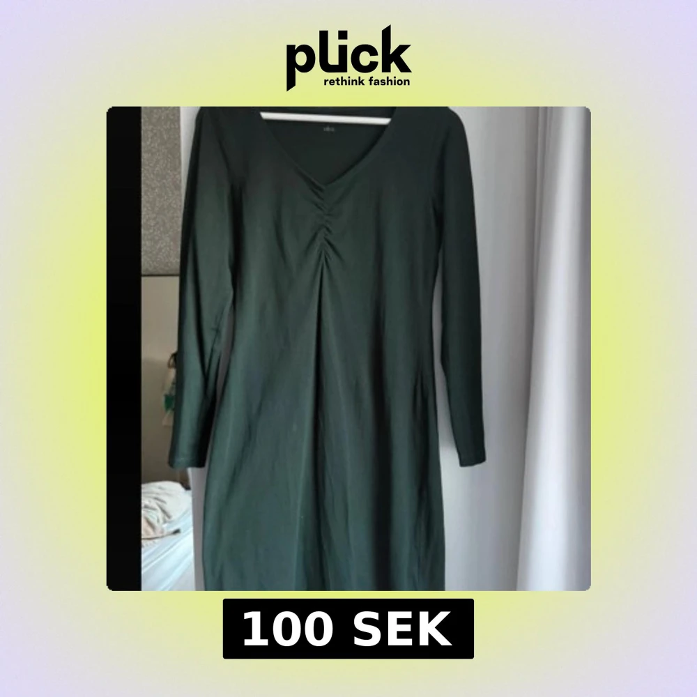 En stilren mörkgrön klänning från Ellos med lång ärm och v-ringning. Storlek står ej men passar M/L. Använd enstaka gång.