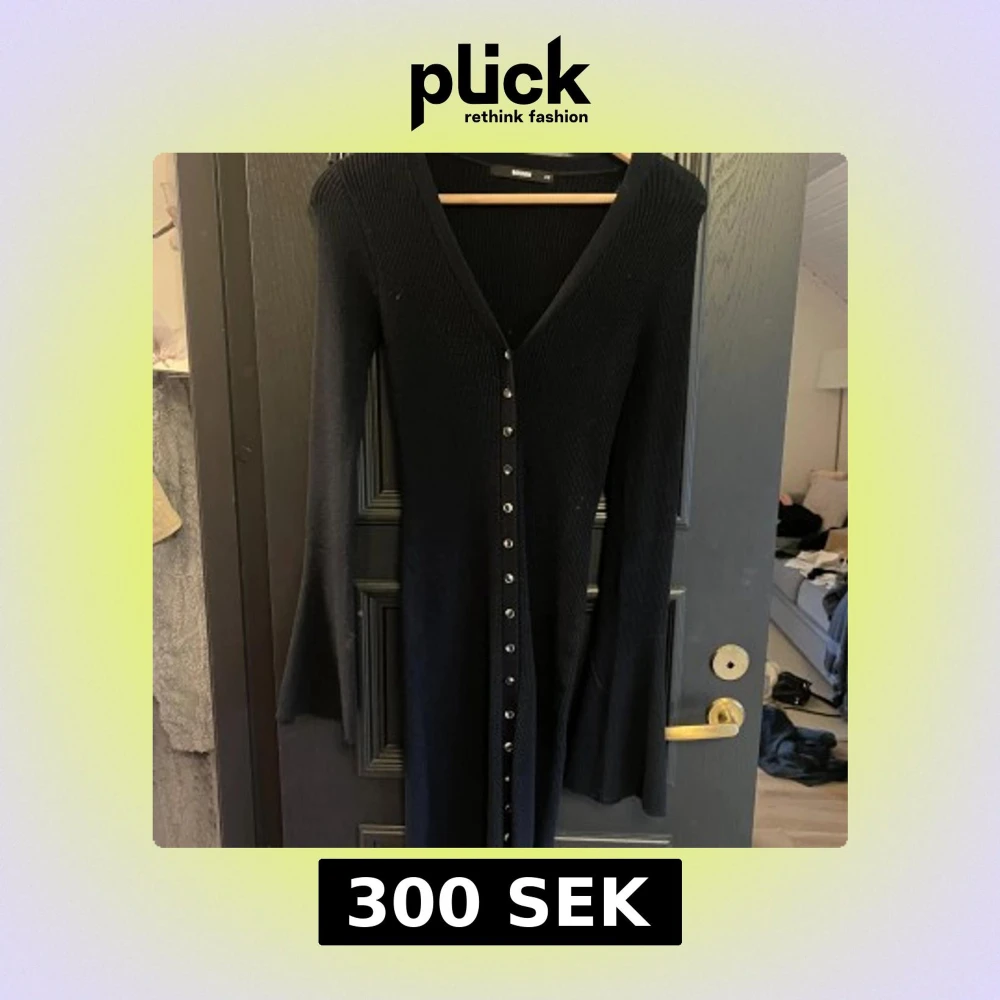 Snygg svart långklänning från BikBok i ribbad stickad kvalitet. Klänningen har lång ärm, v-ringning och knappar hela vägen framtill. Perfekt för dig som gillar en stilren look💕💕