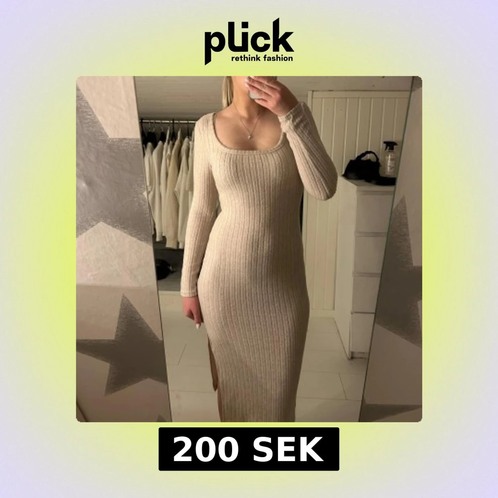 Snygg beige klänning med lång ärm och slits på sidan av benet. Den har en tight passform som framför kurvor med mera, Perfekt för en stilren look och passar till olika tillfällen💌sitter superfint på och har suppeeer skönt material. Storlek xs🤞🏻använd 1 gång så inga tecken på användning så inga fläckar eller hål! Pris: 190
