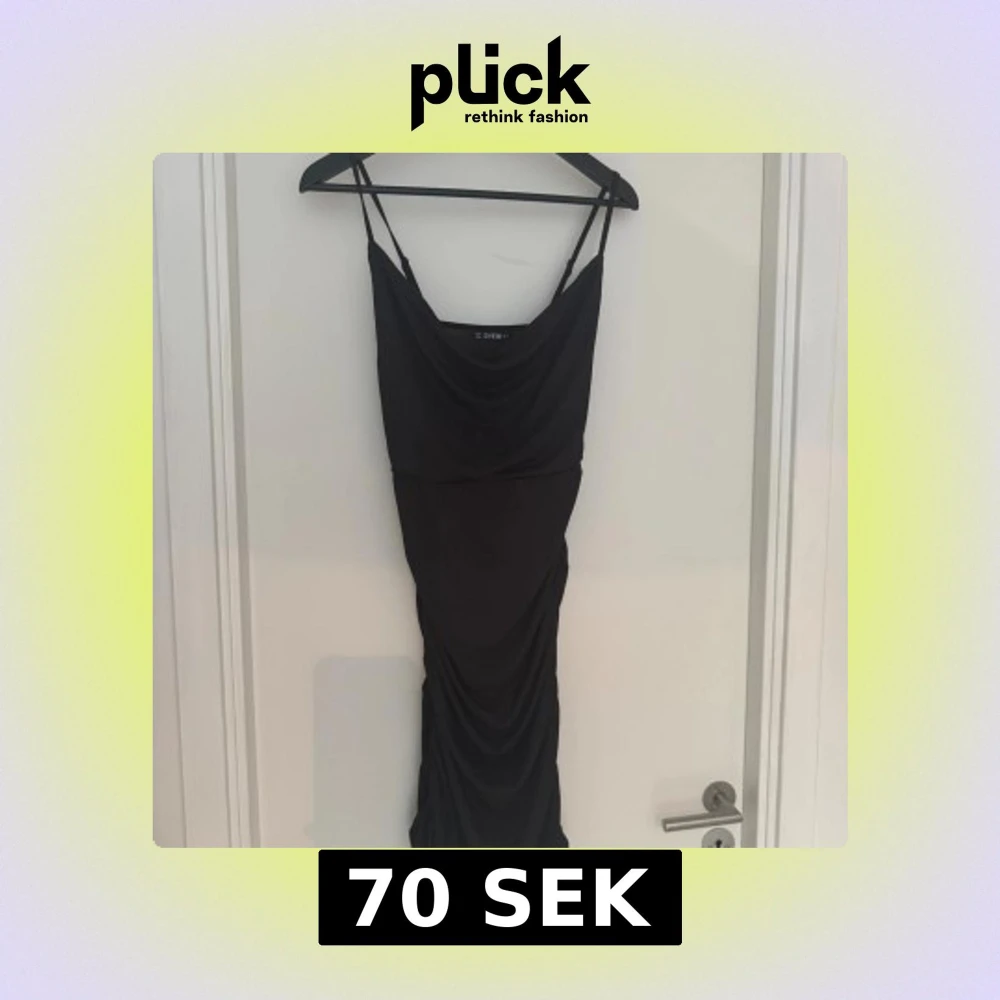 Svart långklänning från SHEIN med tunna axelband och draperad halsringning. Klänningen är ribbad och har rynkade detaljer längs sidorna för en snygg siluett. Perfekt för dig som gillar en stilren och trendig look.