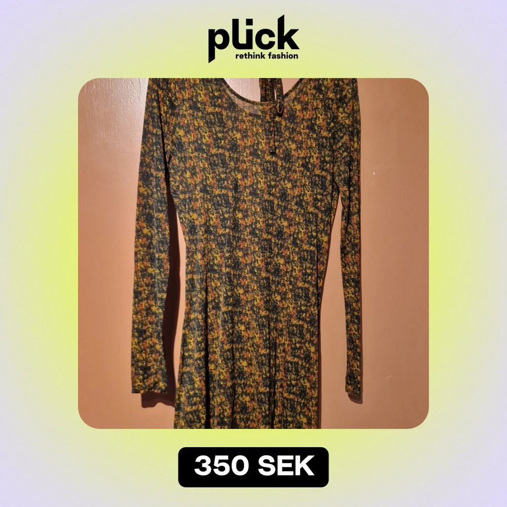 Säljer en superfin mönstrad klänning från Dagmar i storlek S. Klänningen har ett färgglatt mönster i gult, orange och svart. Den har långa ärmar och en snygg öppen rygg med drapering. Perfekt för höst och vår! 🖤💛