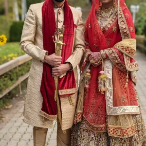 Indiska bröllops kläder för brud och brudgum, från Indien. Endast använda en gång. Paket pris: 7000. Klänning: 3500. Sherwani: 4000