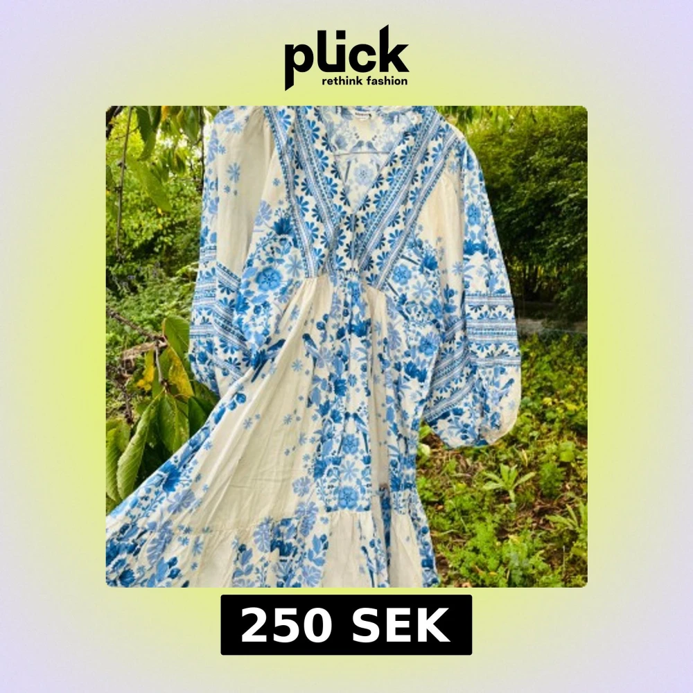 Superfin långklänning från indiska i vitt med blått blommönster. Klänningen har v-ringning, voluminösa långa ärmar