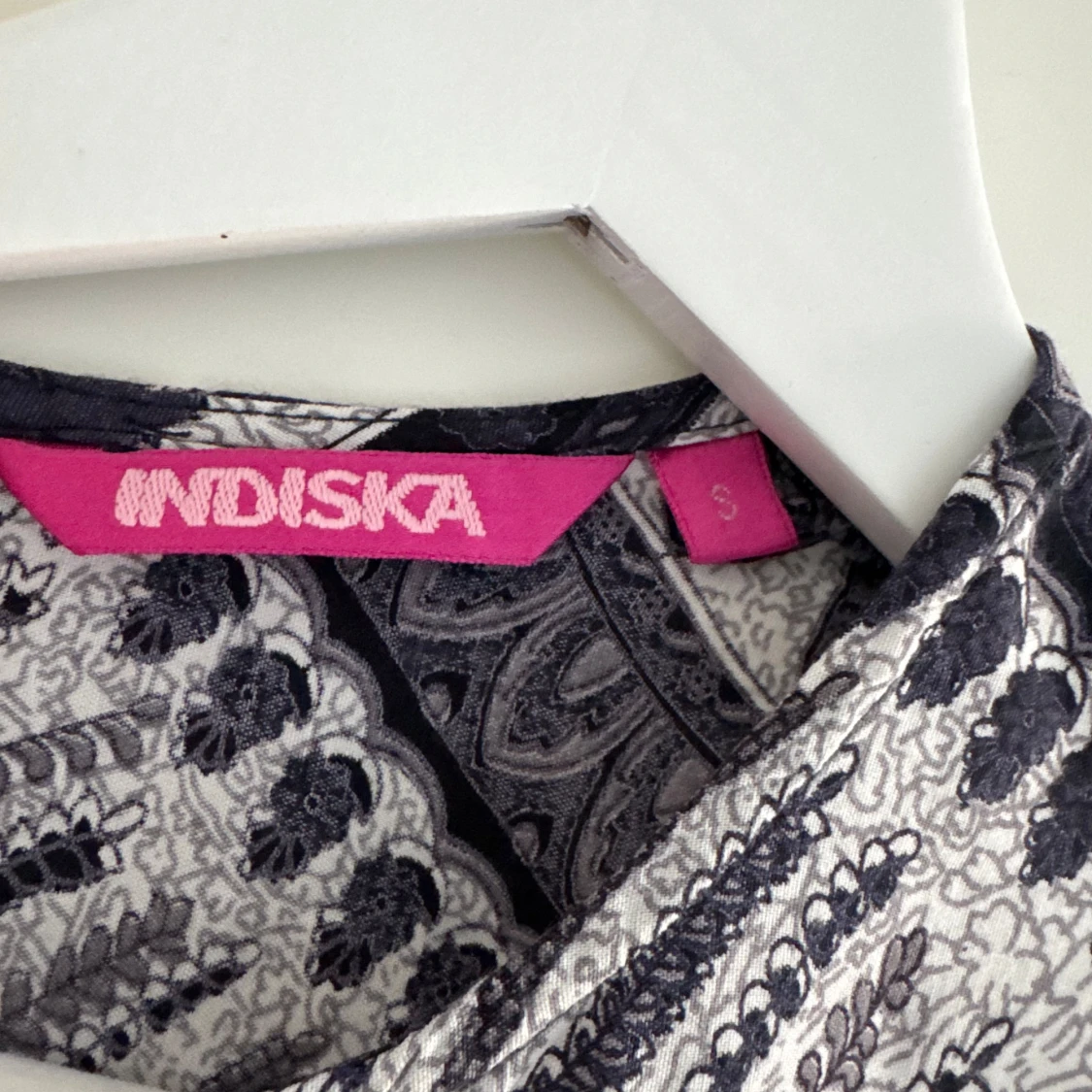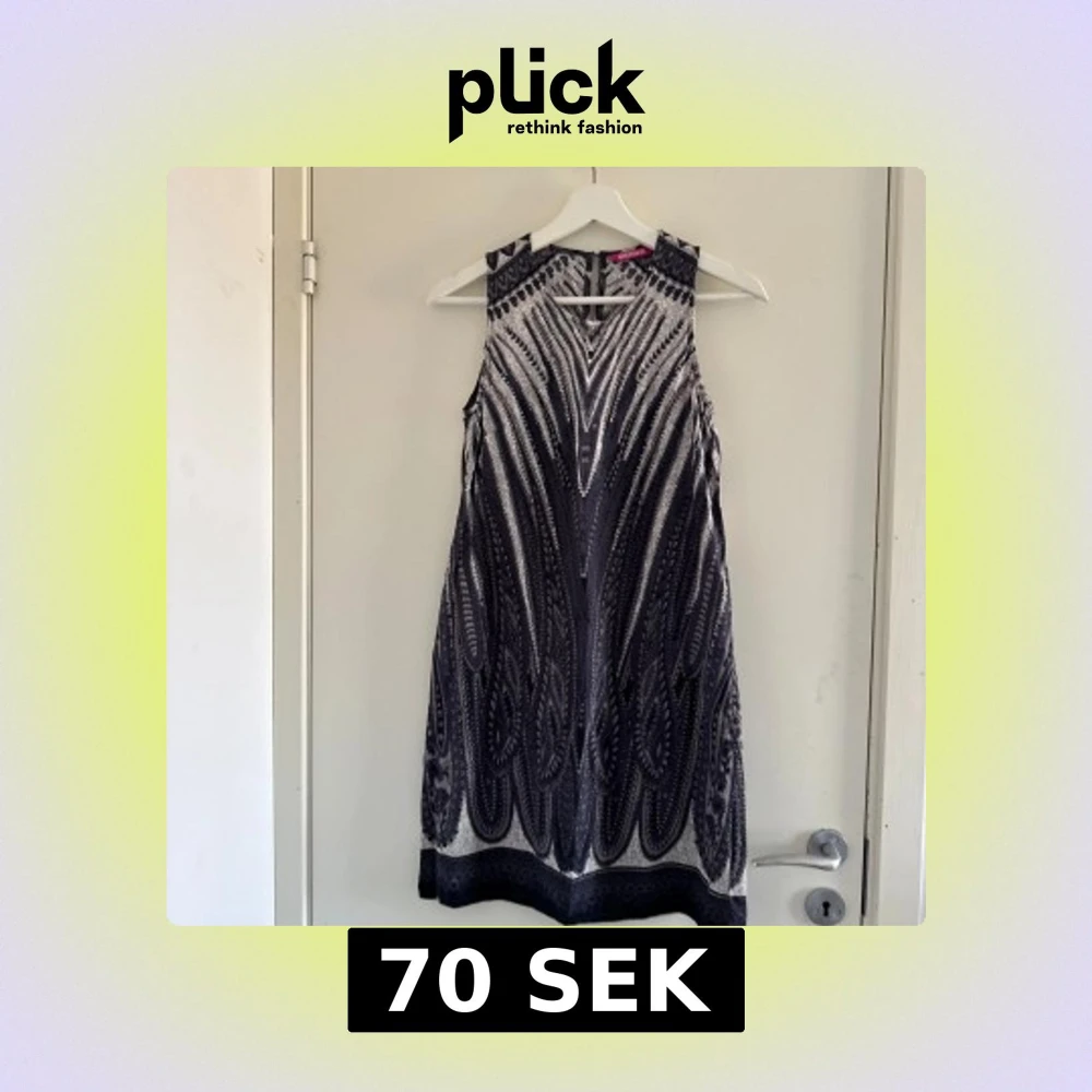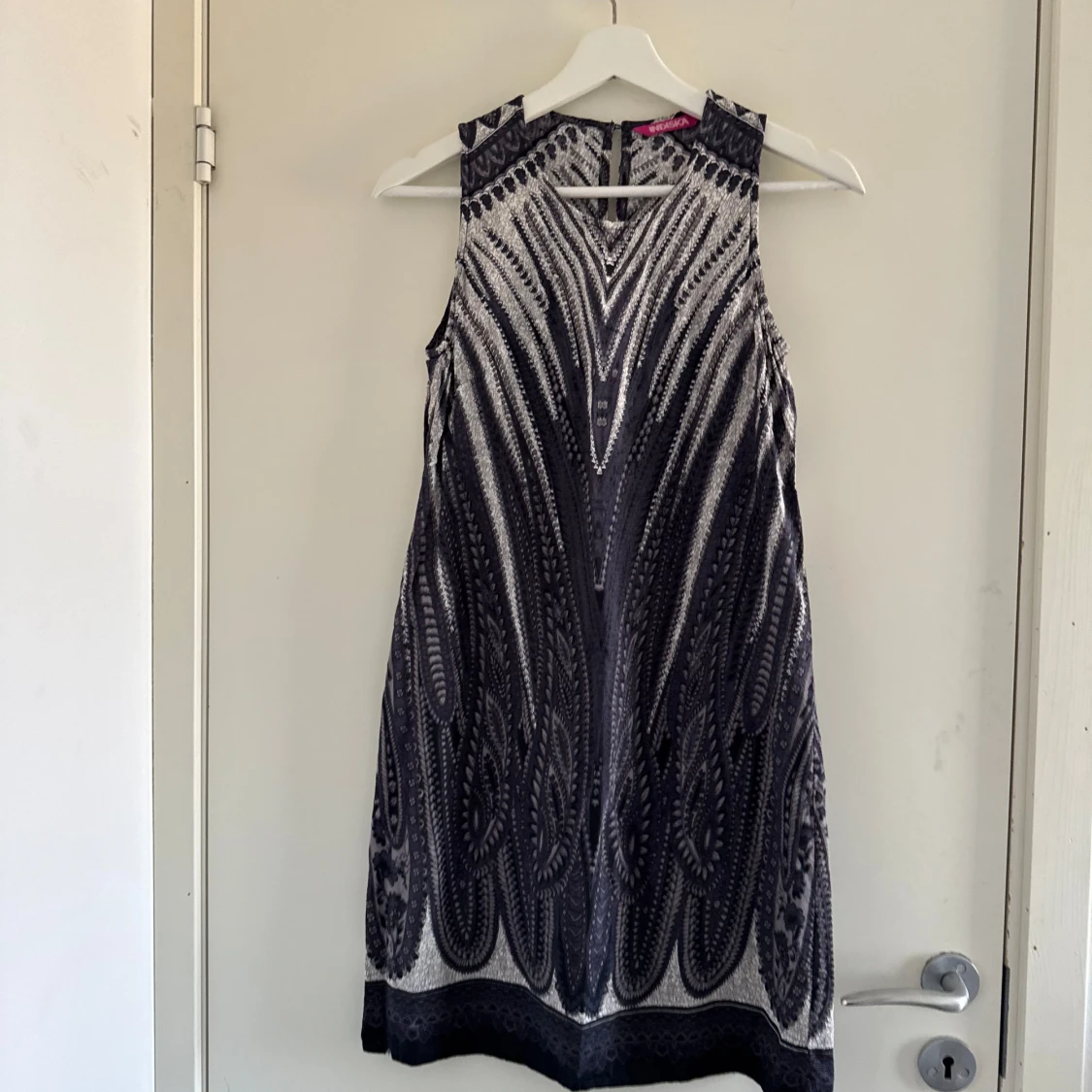 Snygg ärmlös klänning från Indiska med ett unikt svartvitt mönster. Klänningen har en elegant design med rund hals och dragkedja i ryggen. (Katt o kanin finns i hemmet)
