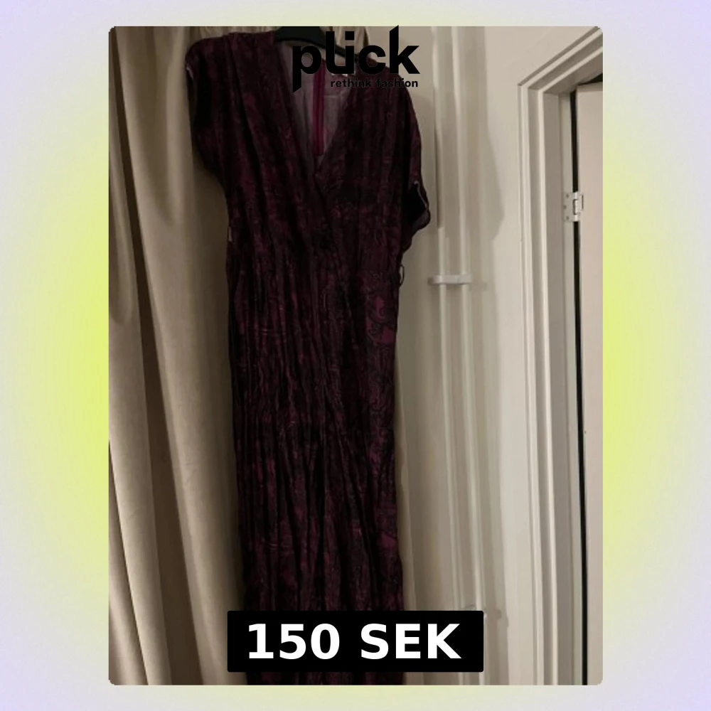 Säljer en mörklila byxdress med diskret mönster och korta ärmar. Klänningen har v-ringning och ett mjukt, fallande tyg som ger en avslappnad siluett. Perfekt för dig som gillar unika detaljer och djupa färger.