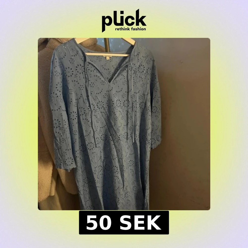 Säljer en ljusblå klänning från Indiska i storlek M. Klänningen har v-ringning med knytband, trekvartsärm och är täckt av broderade blommor med hålmönster. Materialet känns lätt och luftigt, perfekt för varmare dagar.