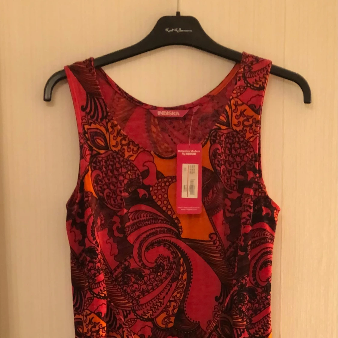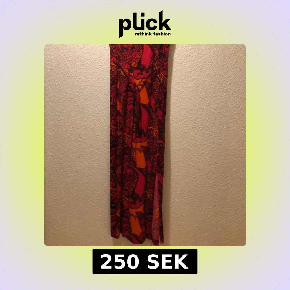 Säljer en maxiklänning från Indiska med färgstarkt mönster i rött, orange och rosa. Klänningen är ärmlös, har rund halsringning och ett coolt paisleyinspirerat tryck. Perfekt för dig som vill sticka ut med en bohemisk vibe.