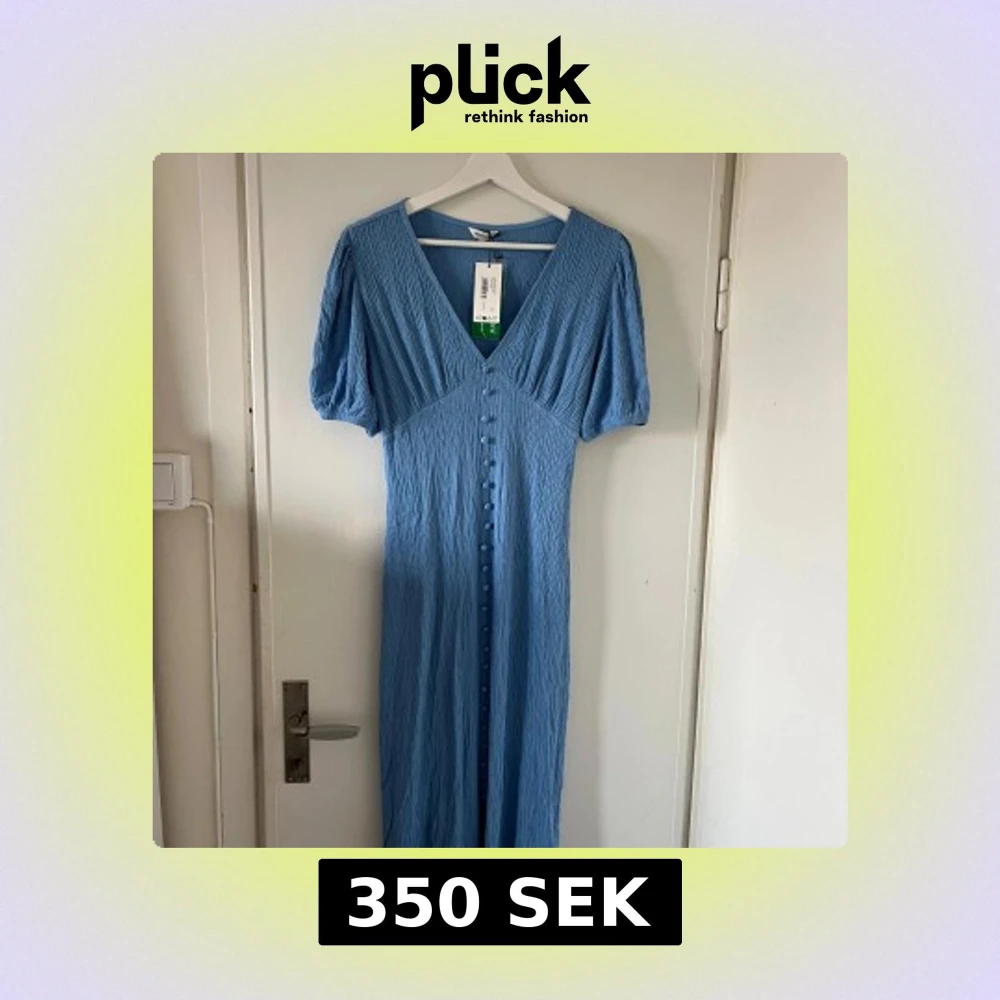 Säljer en blå klänning från Object med v-ringning och knappar framtill. Klänningen har korta ärmar och är i ett lätt och luftigt material. Aldrig använd och har prislappen kvar. Köptes ny för 600kr.