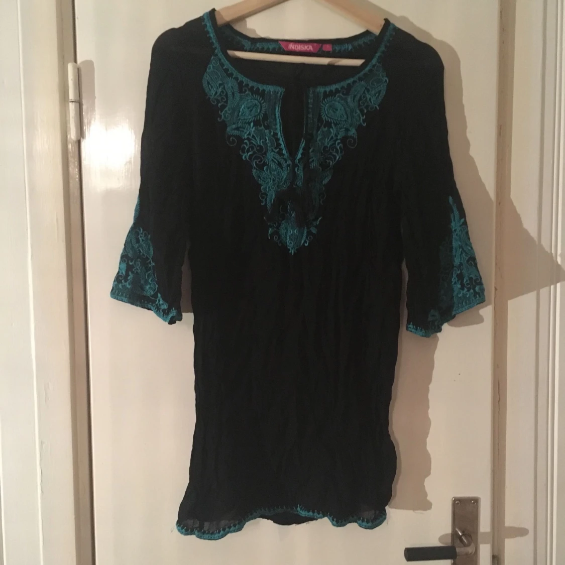 Fin svart tunika från Indiska med turkosa detaljer, i tunt, transparent tyg. 100% viskos. Knappt använd. Har swish, köparen står för frakt.