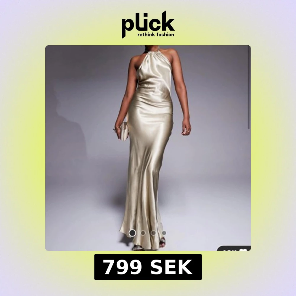 TRYCK EJ PÅ KÖP NU! Kollar intresse på denna balklänning! Superfin champagnefärgad långklänning i satin med halterneck och öppen rygg. Oanvänd med prislapp kvar.